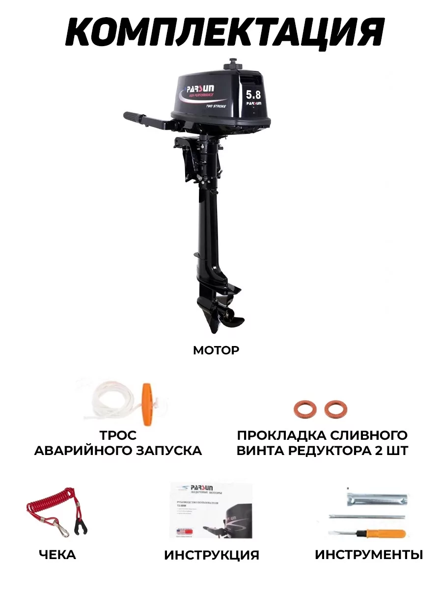 Комплектация: инструкция по эксплуатации, прокладка сливного винта редуктора 3 шт., свеча зажигания BPR7HS 1 шт., трос аварийного запуска, чека, шплинт φ2.5×20, отвертка, свечной ключ, мешочек для инструментов