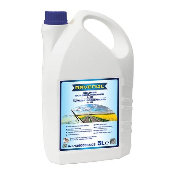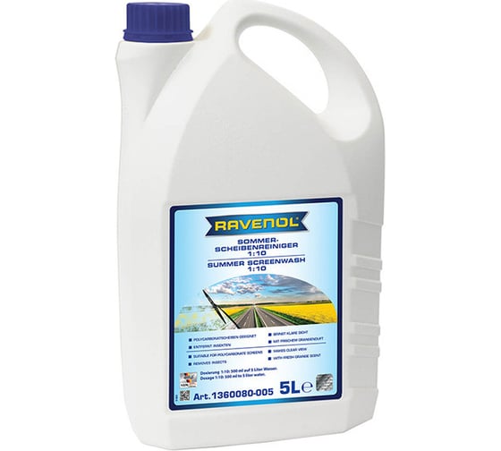 RAVENOL Sommerscheibenreiniger Konzentrat 1:10 — концентрированное средство для приготовления летней стеклоомывающей жидкости. Эффективно удаляет дорожную пыль, следы насекомых, масляную пленку и другие загрязнения.