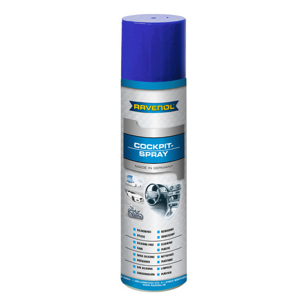 RAVENOL Cockpit-Spray — средство для ухода за пластиковыми и виниловыми элементами интерьера автомобиля. Обновляет поверхность, придаёт ухоженный внешний вид и защищает от старения.