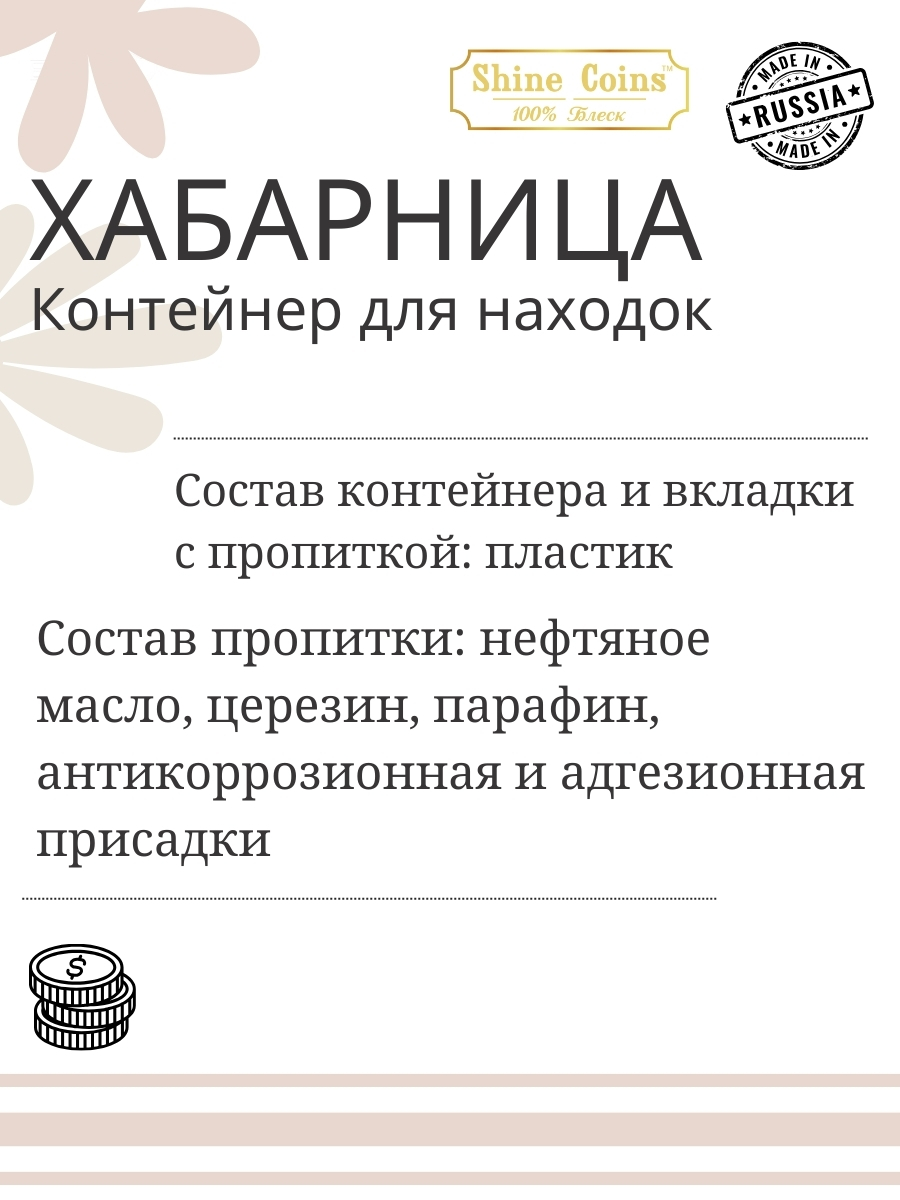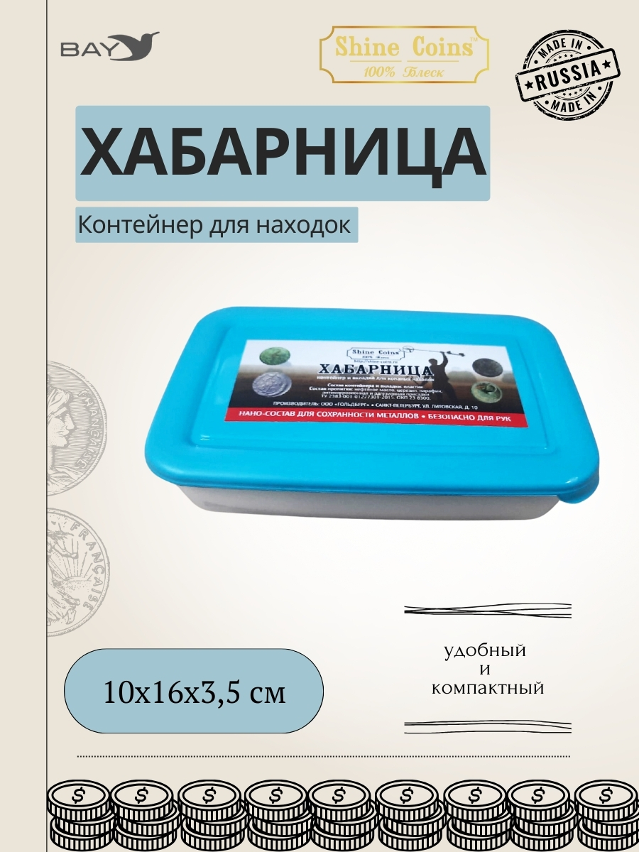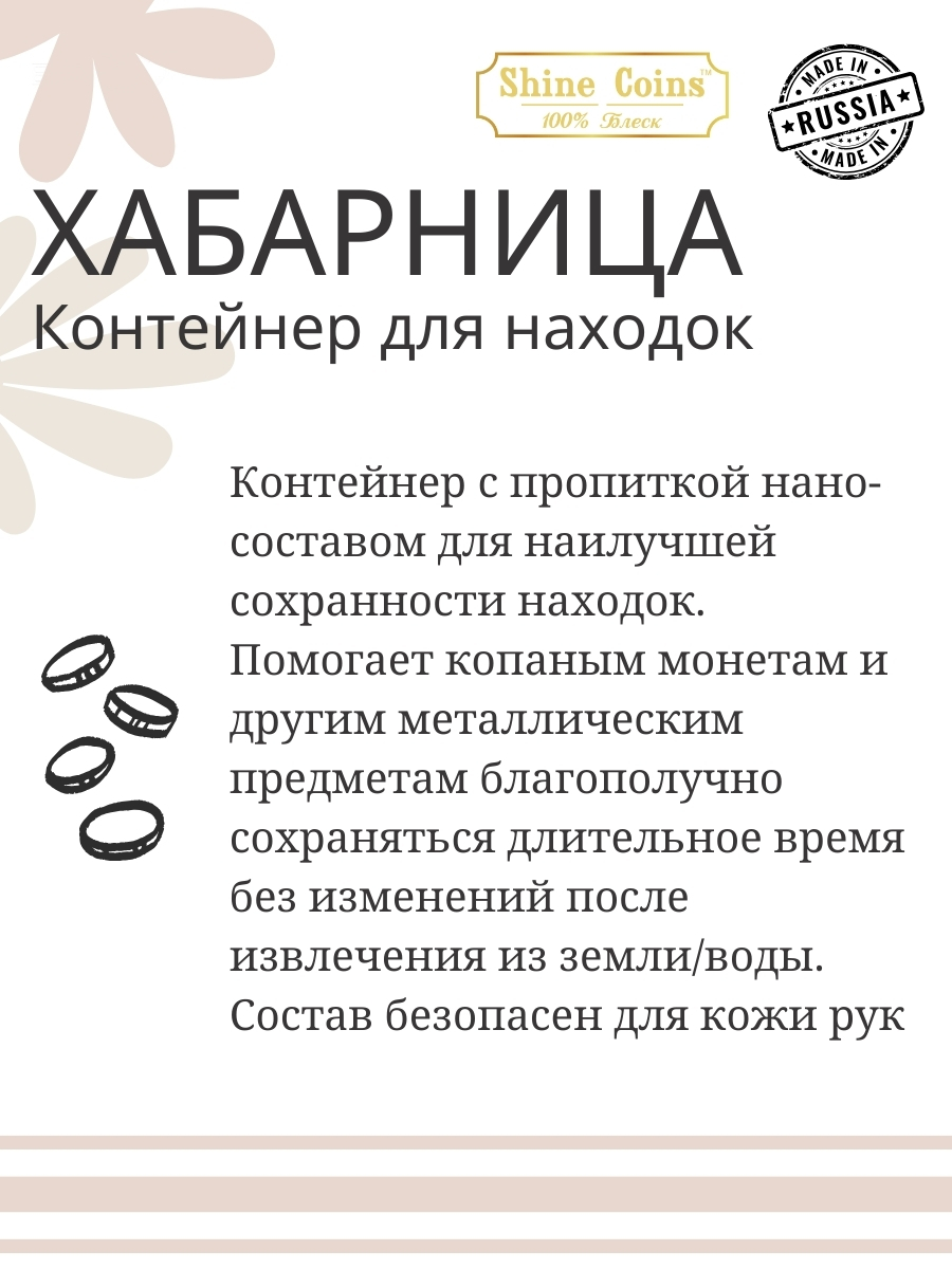 Уникальный контейнер с инновационной пропиткой для профессиональной консервации металлических находок после извлечения из земли или воды. Запатентованная технология обеспечивает оптимальные условия для длительного хранения без окисления и коррозии.
