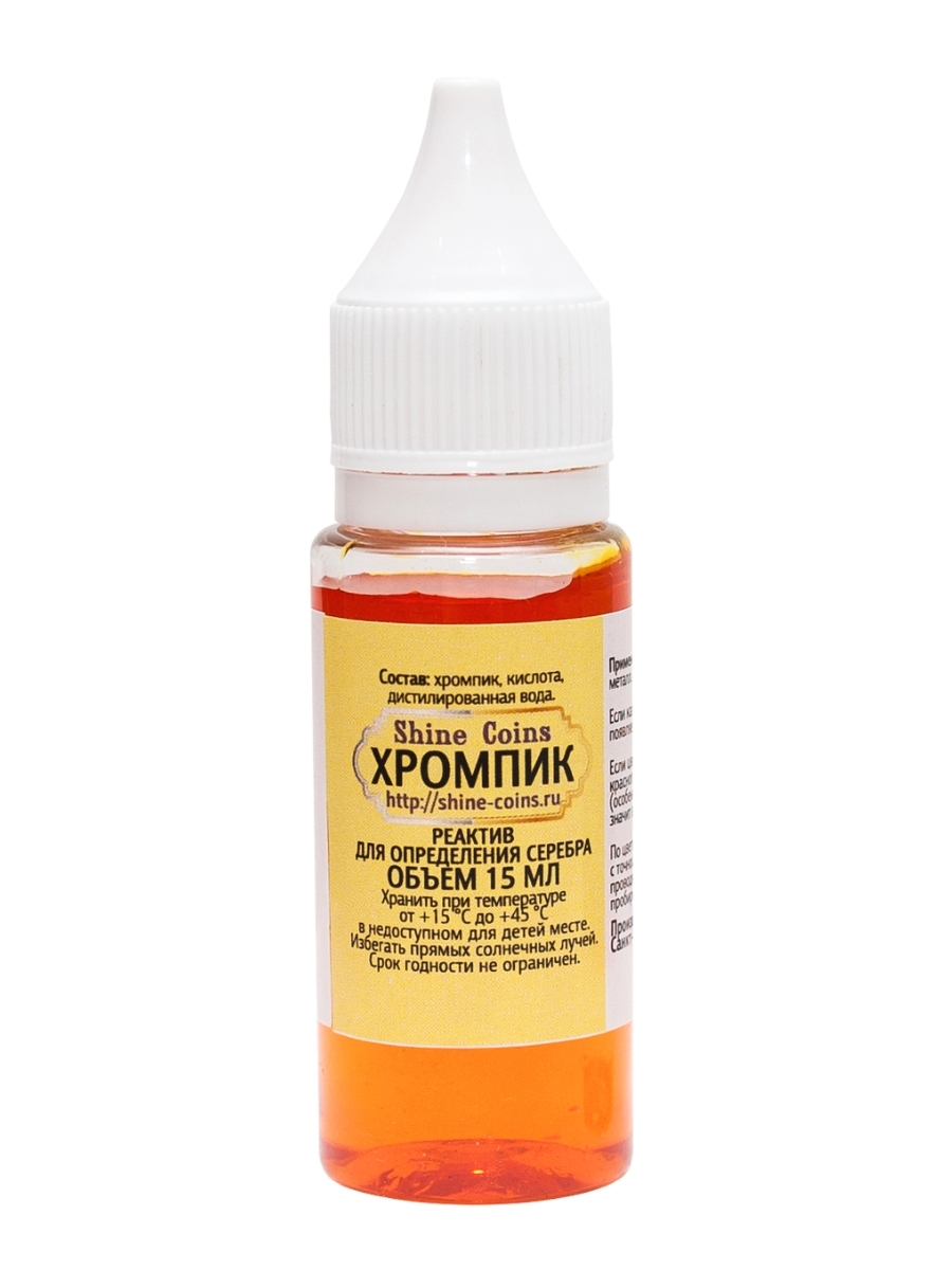 Специализированный реактив для оперативного определения содержания серебра в сплавах. Действие основано на химической реакции между хромпиком и серебром, которая вызывает характерное изменение цвета.