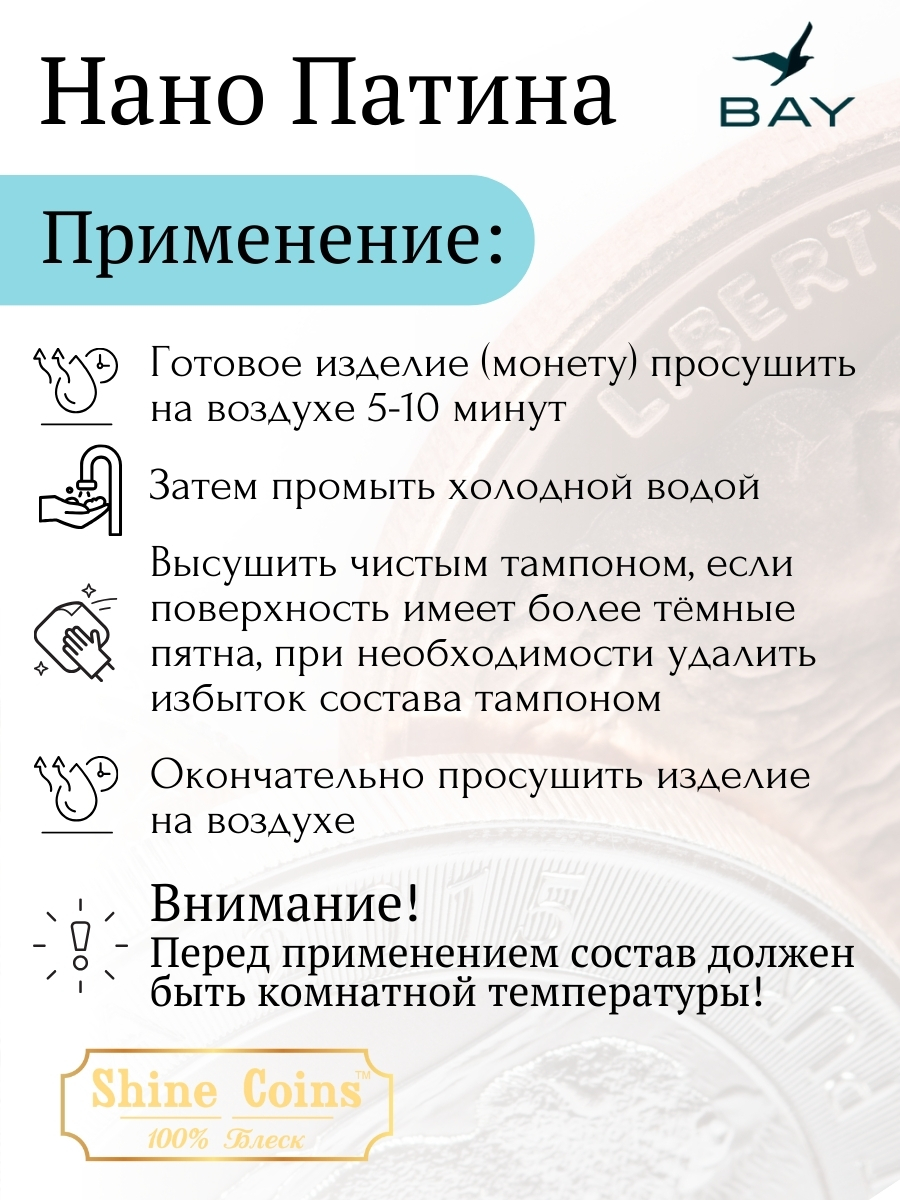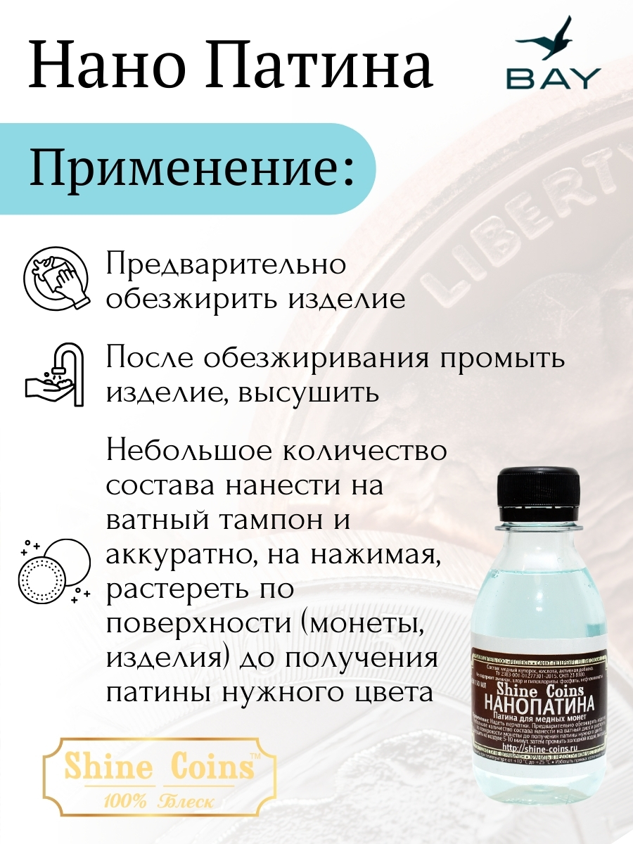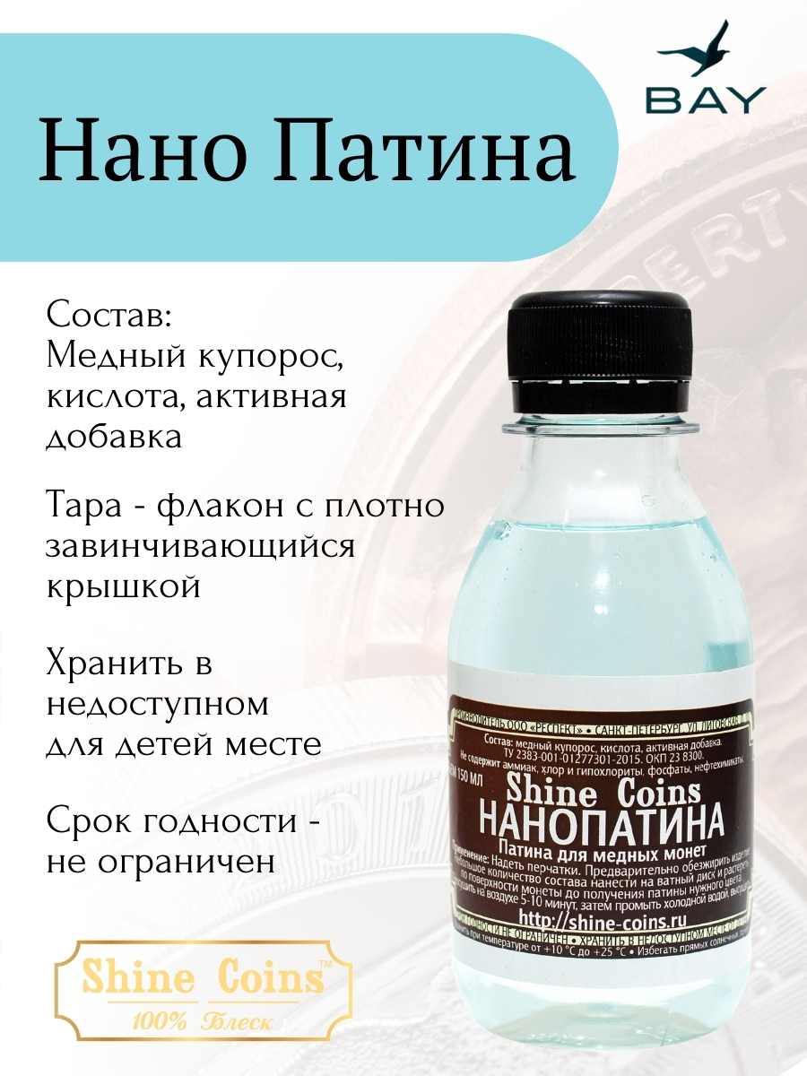 Продукт разработан для декоративного состаривания медных монет и изделий. Позволяет создавать контролируемые эффекты патинирования с естественным внешним видом.