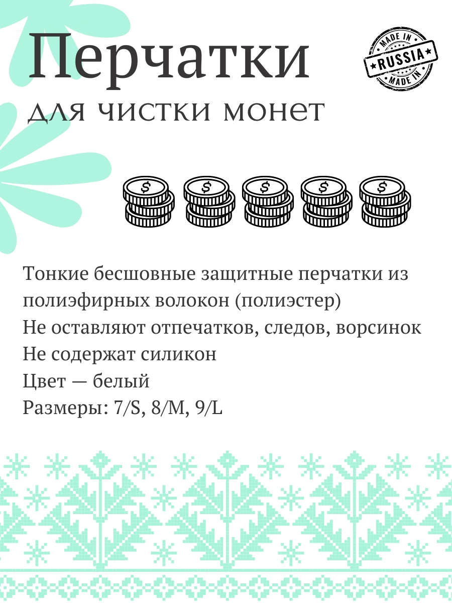 Специализированные перчатки для профессиональных нумизматов и коллекционеров, обеспечивающие безопасный контакт с монетами и другими ценными предметами. Изготовлены по бесшовной технологии, что исключает риск повреждения поверхности коллекционных экземпляров.