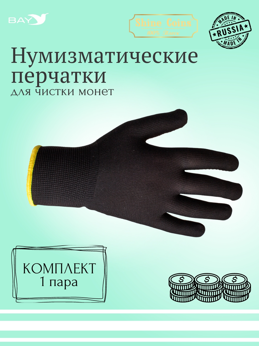 Специализированные черные перчатки для работы с ценными нумизматическими материалами и коллекционными предметами. Изготовлены по бесшовной технологии из высококачественного полиэстера, обеспечивают надежную защиту экспонатов от загрязнений и повреждений.