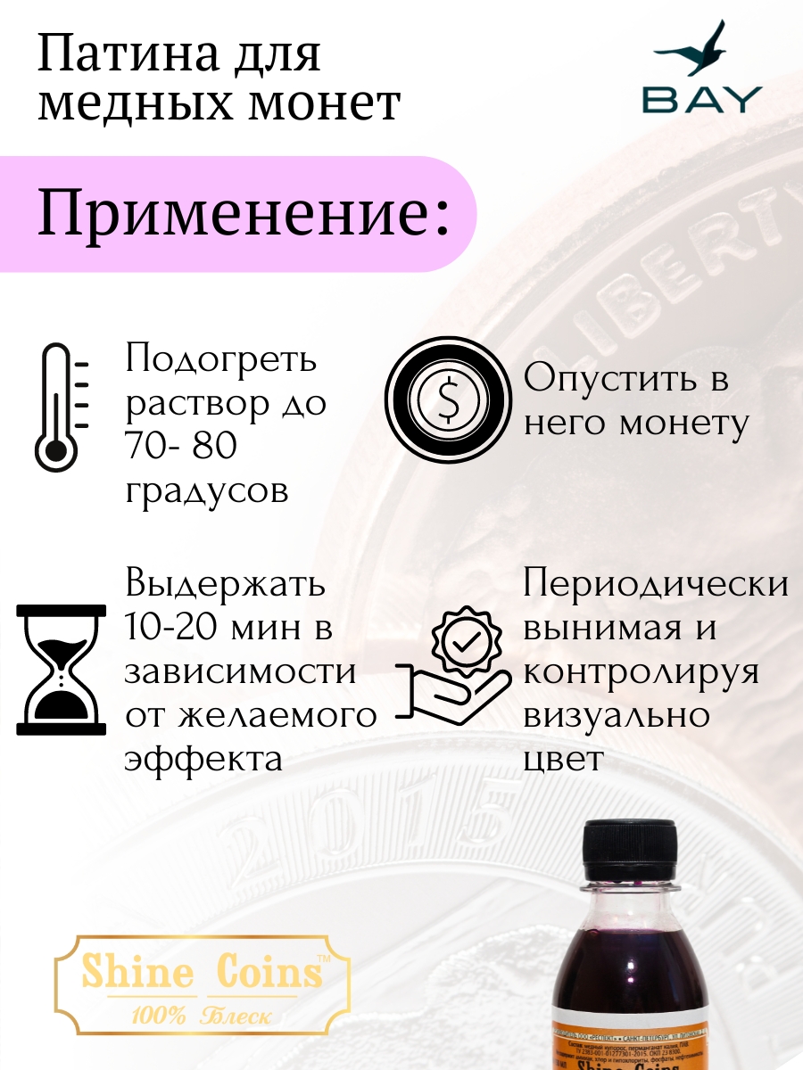 Продукт предназначен для создания декоративной патины на медных монетах. Позволяет добиться эффекта естественного состаривания и придает изделиям благородный антикварный вид.