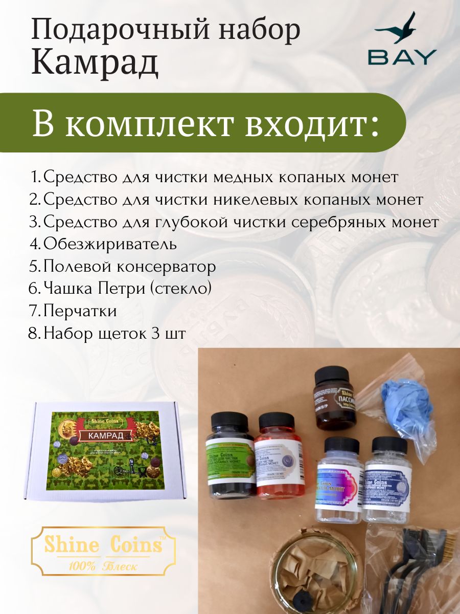 Набор включает все необходимое для бережной очистки и сохранения копаных монет различных металлов: