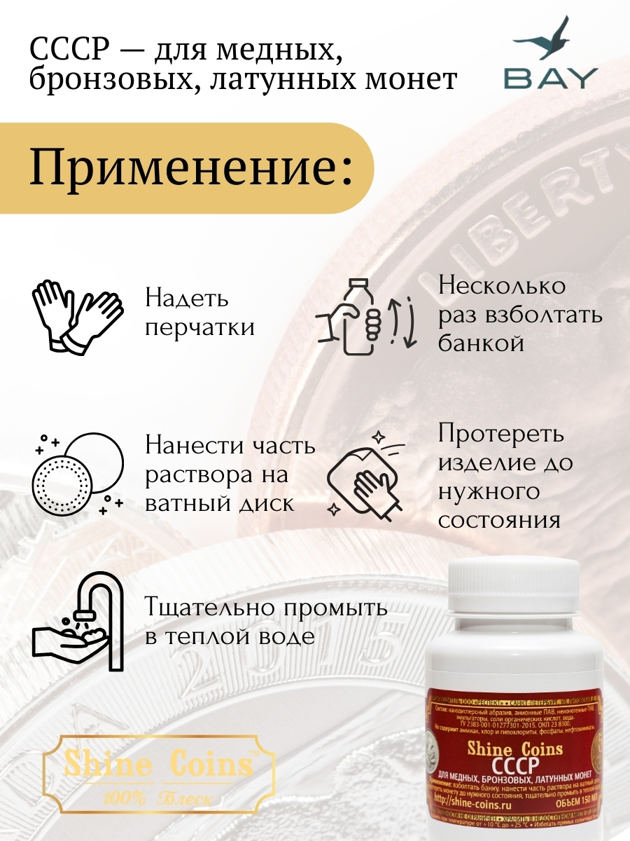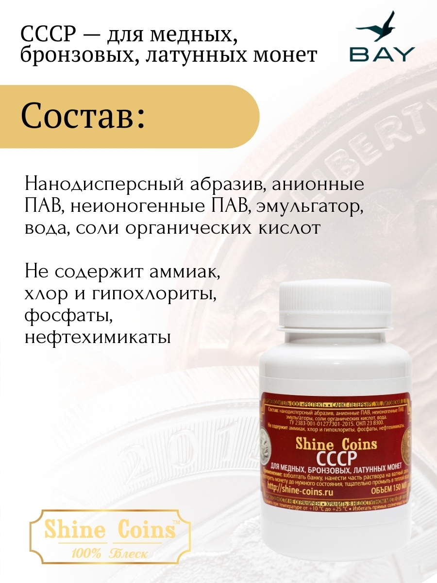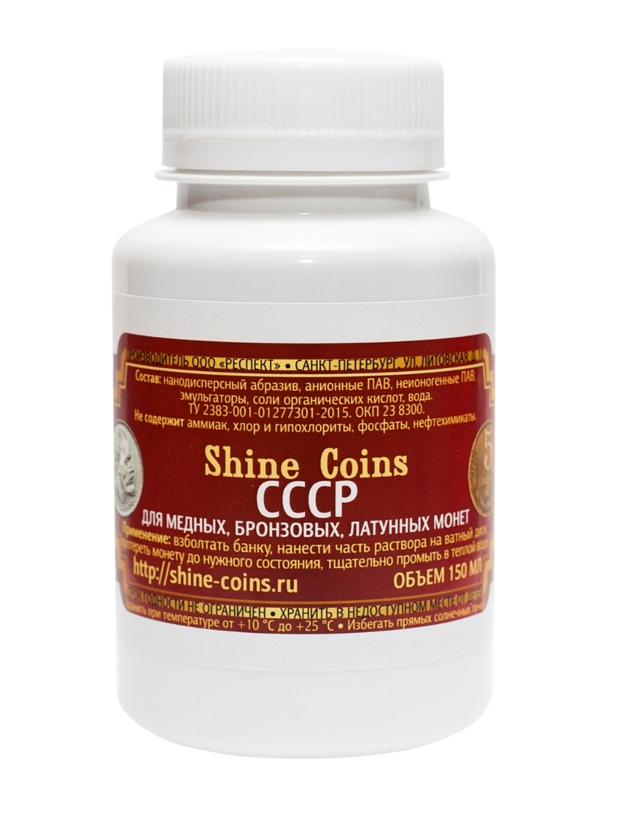 Специализированный состав для бережной очистки и полировки монет из медных сплавов периода СССР. Разработан с учетом особенностей монетного металла советского периода.