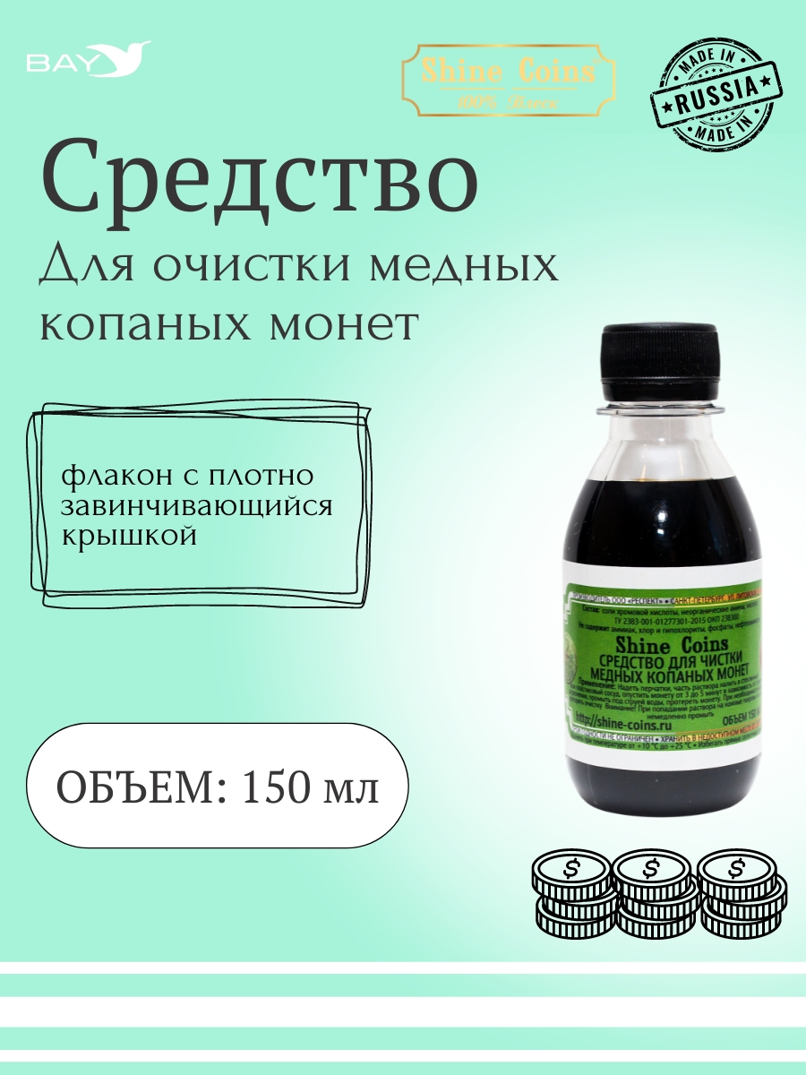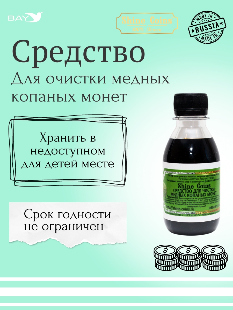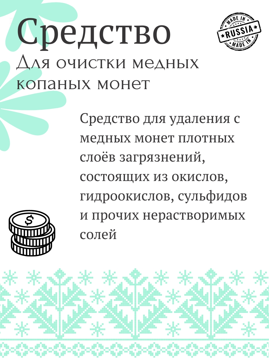 Специализированный химический состав для эффективного удаления сложных загрязнений с медных монет, включая окислы, сульфиды и нерастворимые солевые отложения. Разработан для бережной очистки археологических находок и копаных экземпляров.
