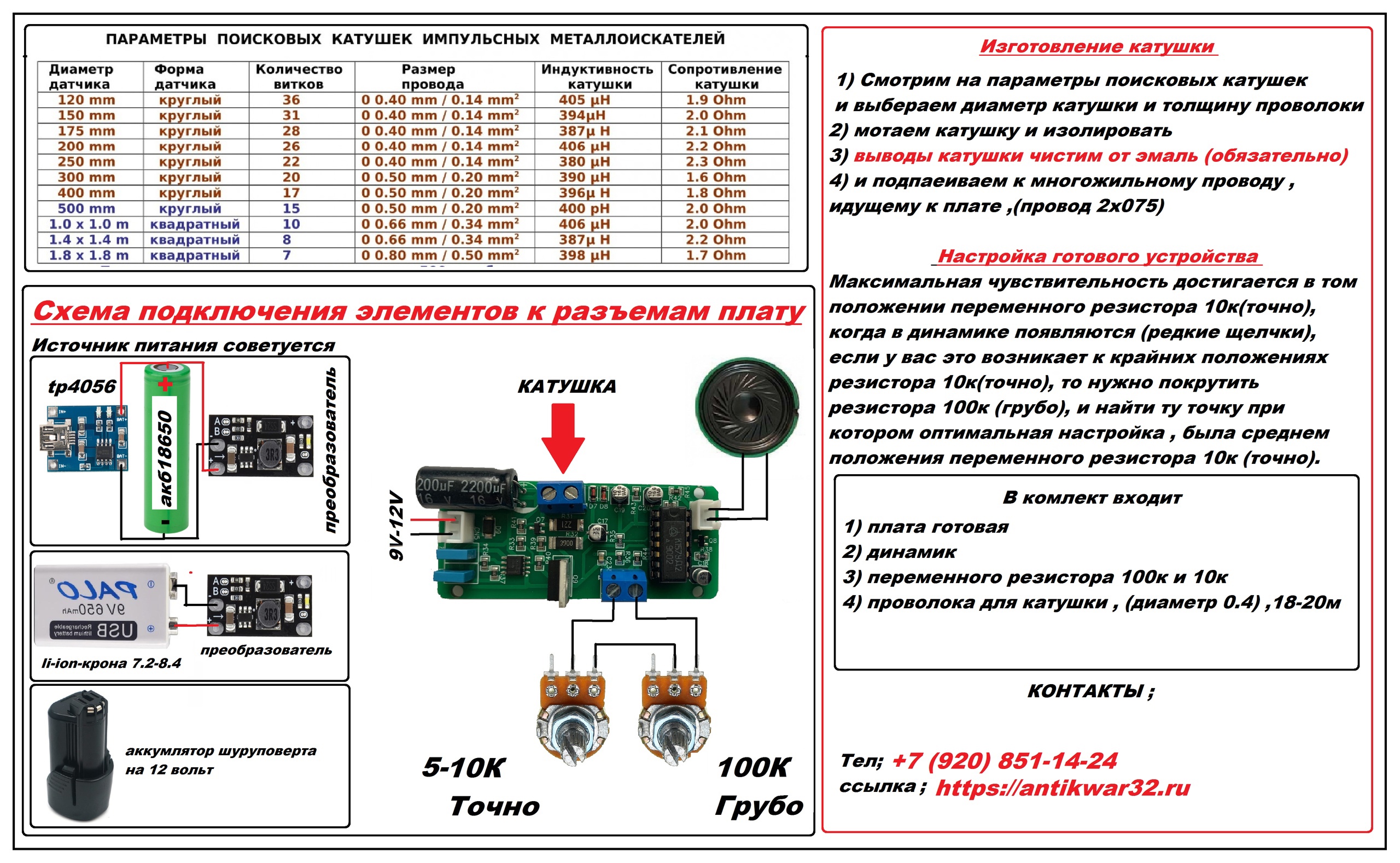 Возможность изготовить поисковую катушку по своему усмотрению, выбрав ее максимально эффективный размер и форму, в зависимости от условий поиска и интересующих вас целей.