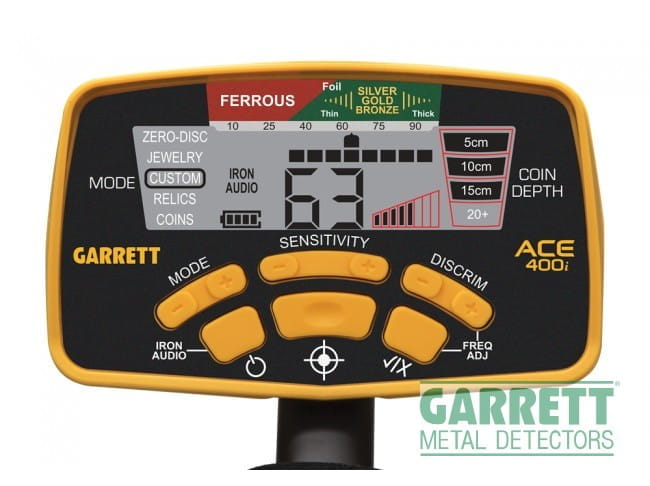 Garrett Ace 400i — новинка 2016-го года от американской компании Garrett. По сути, это более высокотехнологичная замена модели EuroAce и Асе 350.Главное отличие от предшествующих моделей — наличие показаний числа VDI на экране, возможность сдвигать рабочую частоту, расширенный диапазоном железа и регулировка громкости железа.Индекс i в название модели обозначает «international», что означает, что эта модель выпускается для международного рынка. Модель 400i отличается от модели 400 указанием сантиметров, а не дюймов в шкале глубины, расширенным диапазоном железа (6 против 4 у Асе 400), различными надписями над экраном.