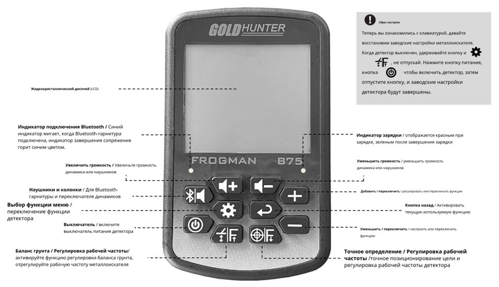Для комфортабельной работы оператора предусмотрен большой ЖК-дисплей, удобный интерфейс управления, функция пинпоинтера, числовой индекс VDI и многотональный звук. Фрогман Б75 имеет на своём вооружении массу всевозможных настроек и вспомогательных функций, 7 программ для поиска и очень удачную на находки поисковую катушку 13 дюймов. Реализована новая технология DST, которая стабилизирует работу прибора во всех режимах на максимальной чувствительности, делая поиск очень стабильным и тихим. Плюс ко всему сказанному, Frogman B75 это очень быстрый прибор, с потрясающем разделением близко расположенных целей.