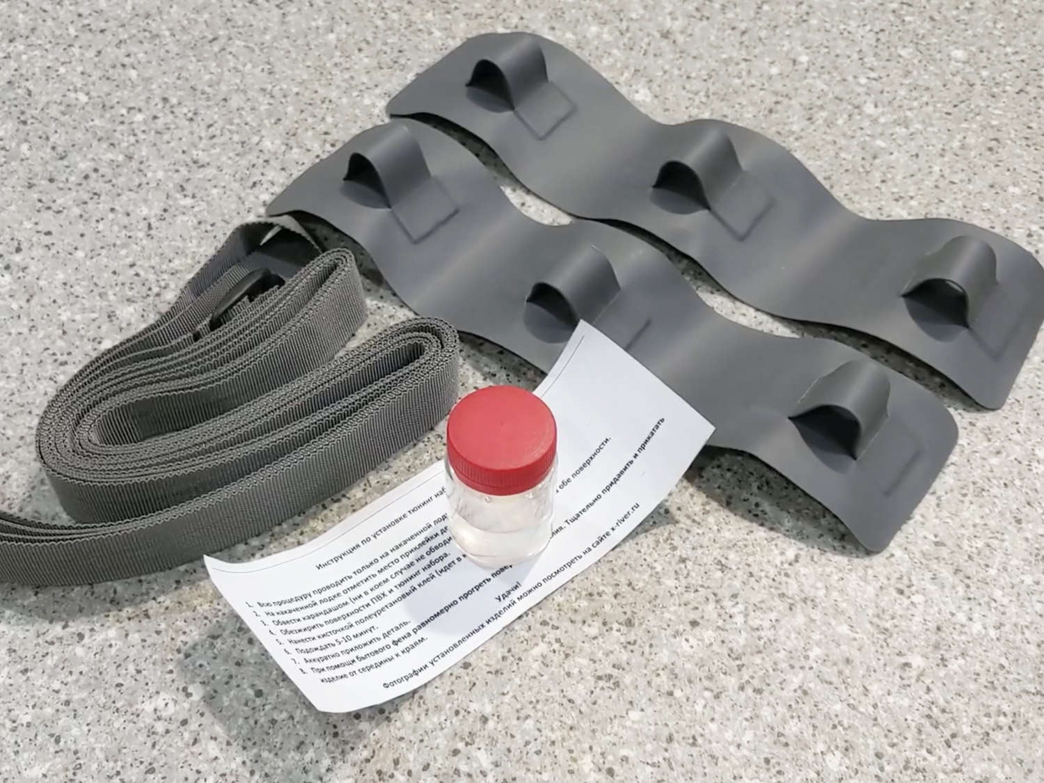 В набор входит 2 крепления носового рундука с тремя петлями, стропа с фиксатором длиной 5 метров, двухкомпонентный клей TEXACOL, инструкция по применению.
