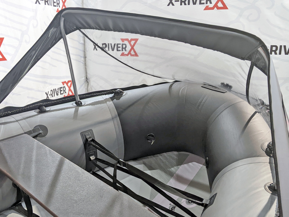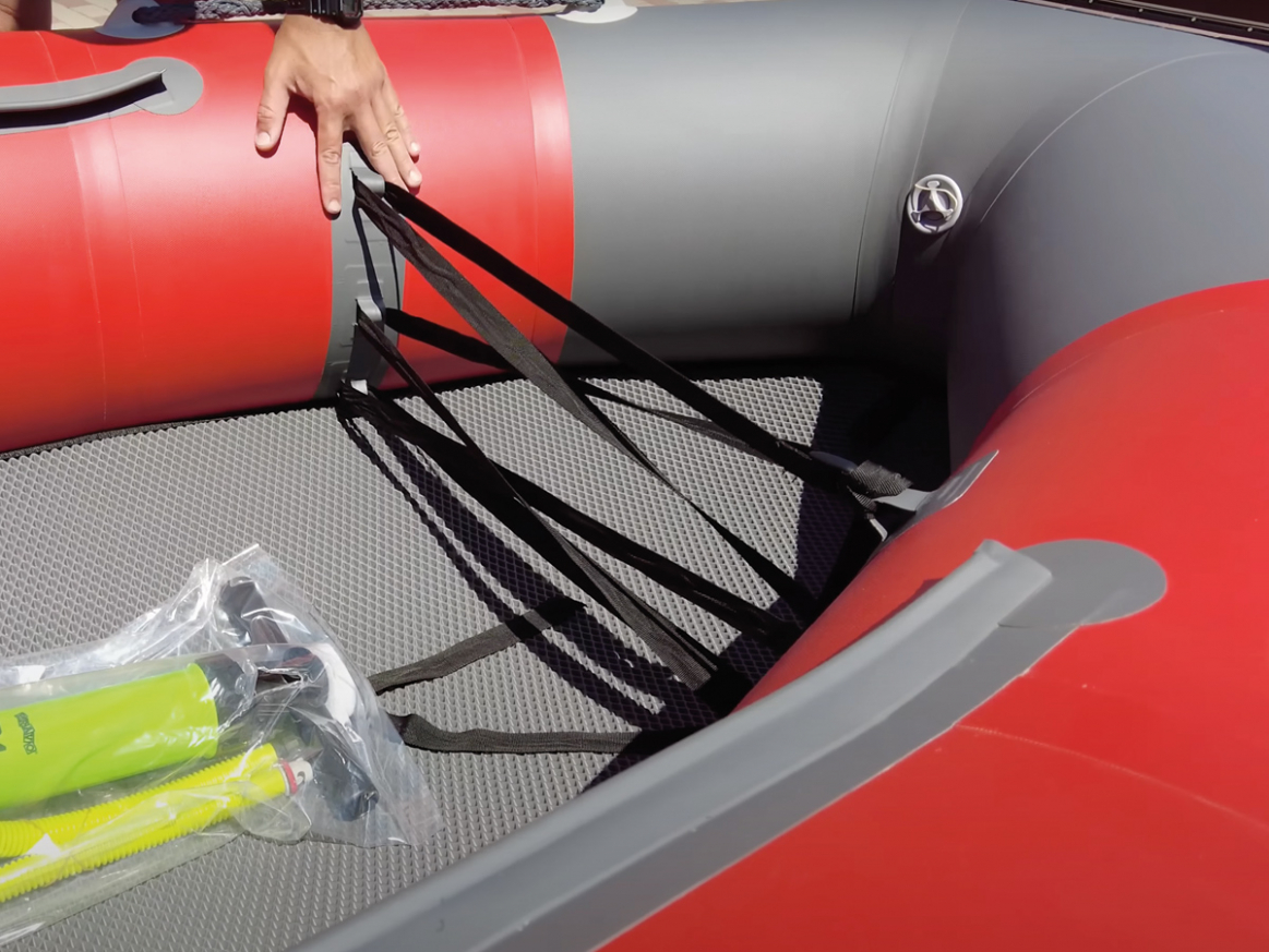 Рундук выполнен из ПВХ ткани, имеет 2 крепления для установки на правый и левый борт. Крепления имеют по три прочные петли, которые надежно вклеены в конструкцию рундука. Через петли продевается стропа наискосок, создавая носовой отсек в лодке. Носовой рундук со вдетой стропой не помешает сворачиванию лодки.