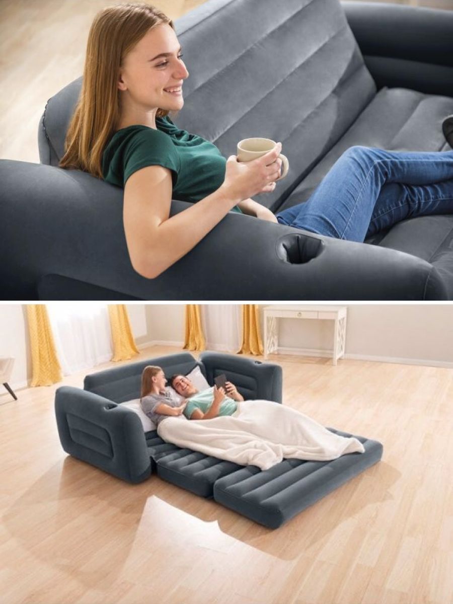 Надувной раскладной диван с подстаканниками INTEX 66552 идеально подходит для тех, к кому часто приезжают гости, но нет запасной кровати. Надувной диван Pull-Out практичен , универсален и легко превращается из дивана в матрац размера queen-size. Встроенный клапан 2 в 1 предназначен для быстрой накачки. Надувная софа оборудована двумя держателями для прохладительных напитков.