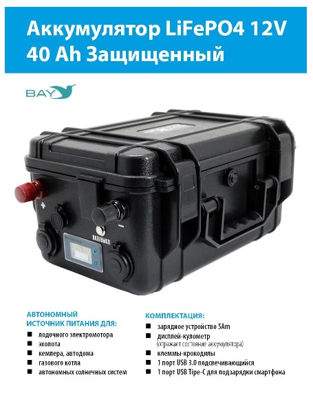 Литий-железо-фосфатная аккумуляторная батарея LiFePO4 BAY емкостью 40 Ач и напряжением 12V
