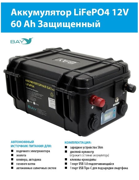 Литий-железо-фосфатная аккумуляторная батарея LiFePO4 BAY емкостью 60 Ач и напряжением 12V