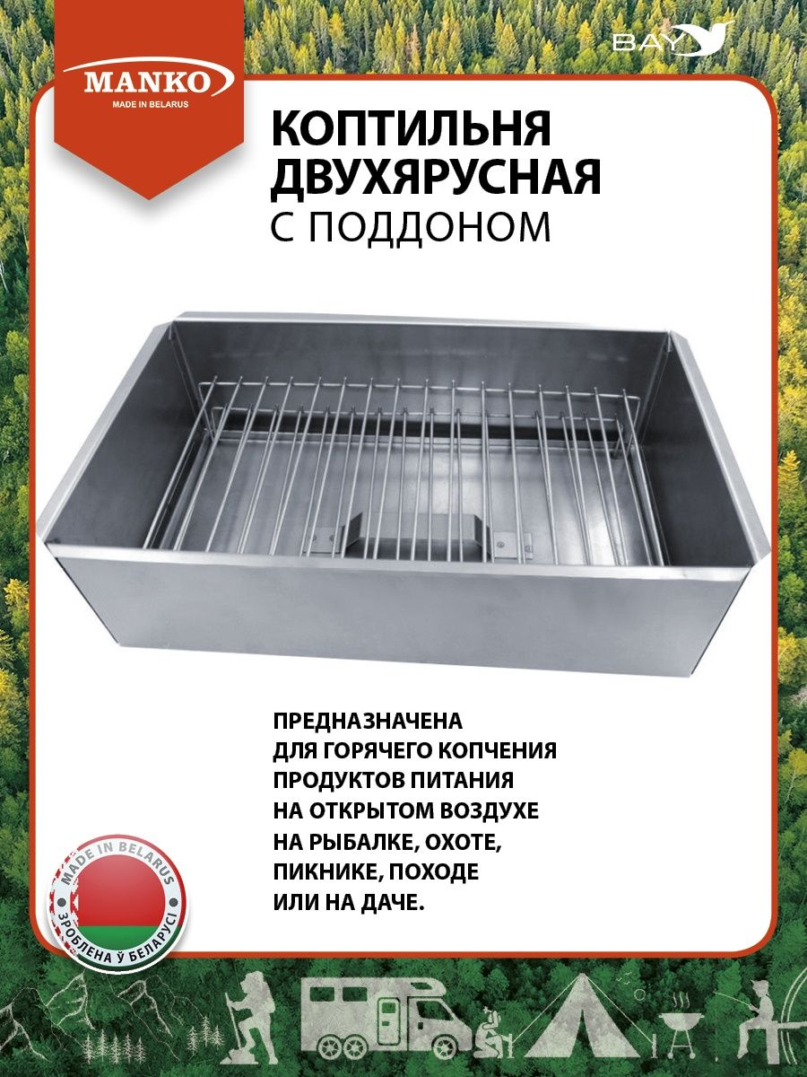 Двухъярусные коптильни с поддоном от компании МАНКО предназначены для горячего копчения продуктов питания на открытом воздухе. Небольшой вес и габариты коптилен позволяют использовать их на рыбалке, охоте, пикнике, походе или на даче. Коптильни можно установить на мангал с горящими углями над открытым огнем. В комплектацию коптилен входит поддон, который препятствует попаданию жира на угли и сохраняет удивительный вкус копченых продуктов. Двухъярусная коптильня из нержавеющей стали размером 480х280х160 мм и весом 4,3 кг, выполнена из нержавеющей стали 1 мм. В комплектацию входит: корпус, крышка, 2 решётки, поддон, задвижная крышка с ручкой. Двухъярусная коптильня из нержавеющей стали размером 480х280х260 мм и весом 4,5 кг, выполнена из нержавеющей стали 1 мм. В комплектацию входит: корпус, крышка, 2 решётки, поддон, задвижная крышка с ручкой. Двухъярусная коптильня из нержавеющей стали размером 380х280х160 мм и весом 3,4 кг, выполнена из нержавеющей стали 1 мм. В комплектацию входит: корпус, крышка, 2 решётки, поддон, задвижная крышка с ручкой. Двухъярусная коптильня из нержавеющей стали размером 380х280х260 мм и весом 4,1 кг, выполнена из нержавеющей стали 1 мм. В комплектацию входит: корпус, крышка, 2 решётки, поддон, задвижная крышка с ручкой. Применение: на дно коптильни положить древесную щепу, выложить продукты на решетки, закрыть крышкой и поставить на открытый огонь (мангал).