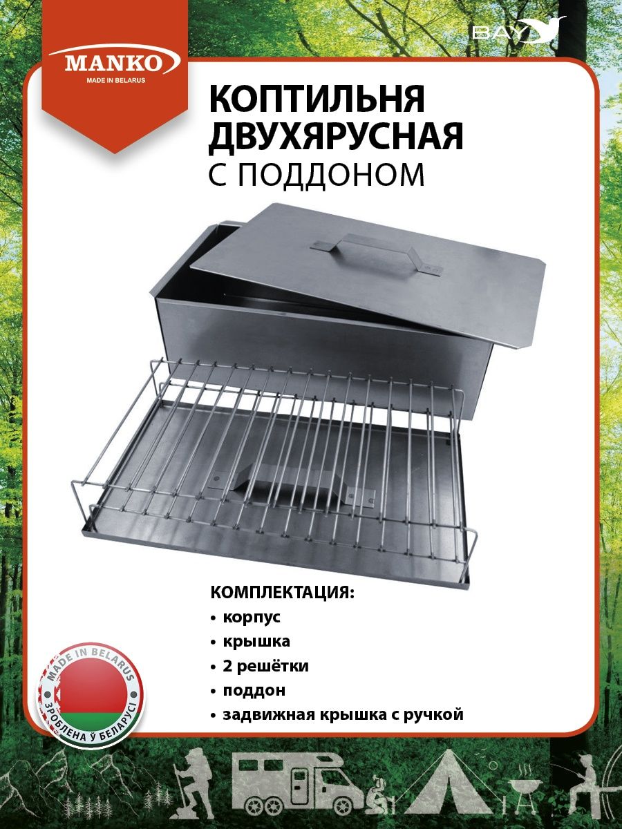 Двухъярусные коптильни с поддоном от компании МАНКО предназначены для горячего копчения продуктов питания на открытом воздухе. Небольшой вес и габариты коптилен позволяют использовать их на рыбалке, охоте, пикнике, походе или на даче. Коптильни можно установить на мангал с горящими углями над открытым огнем. В комплектацию коптилен входит поддон, который препятствует попаданию жира на угли и сохраняет удивительный вкус копченых продуктов. Двухъярусная коптильня из нержавеющей стали размером 480х280х160 мм и весом 4,3 кг, выполнена из стали 0,5 мм. В комплектацию входит: корпус, крышка, 2 решётки, поддон, задвижная крышка с ручкой. Двухъярусная коптильня из нержавеющей стали размером 380х280х160 мм и весом 3,4 кг, выполнена из нержавеющей стали 0,5 мм. В комплектацию входит: корпус, крышка, 2 решётки, поддон, задвижная крышка с ручкой. Двухъярусная коптильня из нержавеющей стали размером 380х280х260 мм и весом 4,1 кг, выполнена из нержавеющей стали 0,5 мм. В комплектацию входит: корпус, крышка, 2 решётки, поддон, задвижная крышка с ручкой. Применение: на дно коптильни положить древесную щепу, выложить продукты на решетки, закрыть крышкой и поставить на открытый огонь (мангал).