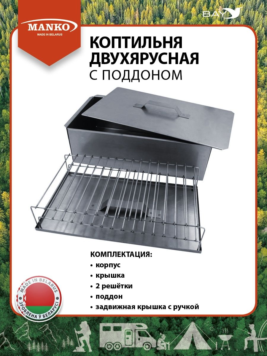 Двухъярусные коптильни с поддоном от компании МАНКО предназначены для горячего копчения продуктов питания на открытом воздухе. Небольшой вес и габариты коптилен позволяют использовать их на рыбалке, охоте, пикнике, походе или на даче. Коптильни можно установить на мангал с горящими углями над открытым огнем. В комплектацию коптилен входит поддон, который препятствует попаданию жира на угли и сохраняет удивительный вкус копченых продуктов. Двухъярусная коптильня из нержавеющей стали размером 480х280х160 мм и весом 4,3 кг, выполнена из нержавеющей стали 1 мм. В комплектацию входит: корпус, крышка, 2 решётки, поддон, задвижная крышка с ручкой. Двухъярусная коптильня из нержавеющей стали размером 480х280х260 мм и весом 4,5 кг, выполнена из нержавеющей стали 1 мм. В комплектацию входит: корпус, крышка, 2 решётки, поддон, задвижная крышка с ручкой. Двухъярусная коптильня из нержавеющей стали размером 380х280х160 мм и весом 3,4 кг, выполнена из нержавеющей стали 1 мм. В комплектацию входит: корпус, крышка, 2 решётки, поддон, задвижная крышка с ручкой. Двухъярусная коптильня из нержавеющей стали размером 380х280х260 мм и весом 4,1 кг, выполнена из нержавеющей стали 1 мм. В комплектацию входит: корпус, крышка, 2 решётки, поддон, задвижная крышка с ручкой. Применение: на дно коптильни положить древесную щепу, выложить продукты на решетки, закрыть крышкой и поставить на открытый огонь (мангал).
