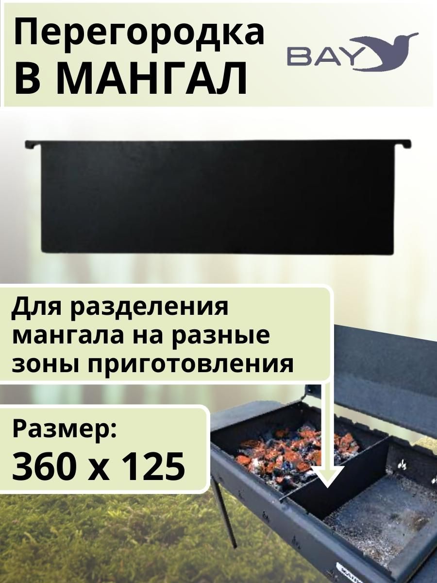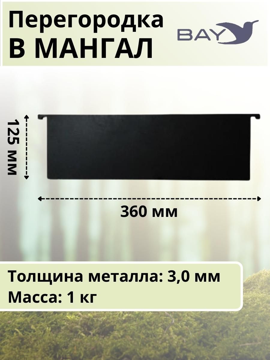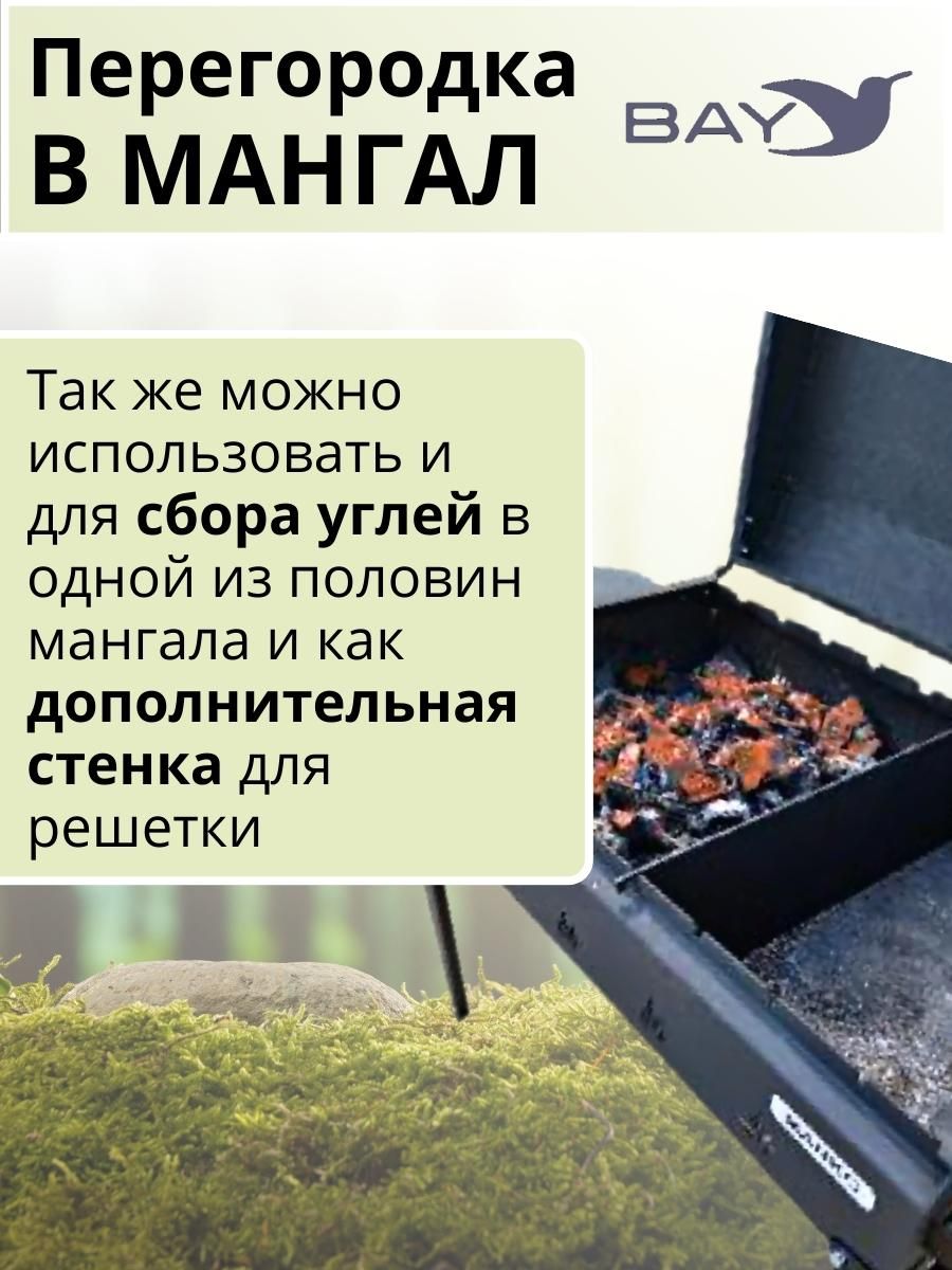 При приготовлении блюд на мангале бывает удобно разделить пространство жаровни на разные зоны. С помощью перегородки это можно сделать легко и эффективно! В одной части готовые угли, на которых можно жарить пищу, а в другой разгораются дрова для следующих порций шашлыка. Материал: сталь 3 мм. Вес 1 кг. Общая длина: 360 мм. Общая высота: 125 мм. Производство Беларусь. Мангал на фото для наглядности, в комплект не входит.