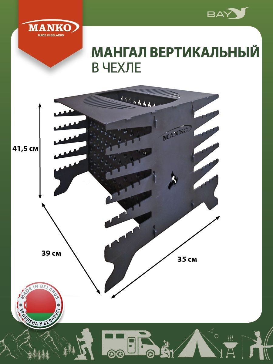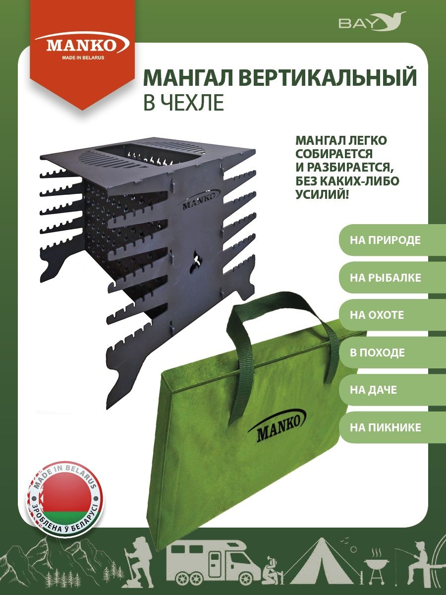 Вертикальный мангал белорусского производителя MANKO, разборной конструкции, на 10 шампуров, окрашенный термостойкой краской до 1000С. Мангал сделан из стали, толщиной 3 мм. В комплекте сумка для переноски и хранения из плотного материала (ПВХ) с надежно пришитыми ручками из широкой стропы (32мм). Основные преимущества вертикального мангала заключаются в следующем: во время приготовления жиры и соки не попадают на угли и продукт не подвергается вредному воздействию пара. Одновременное использование разных способов приготовления, например: 5 шампуров, большая решетка и казан-сковорода единовременно, при габаритах стандартного мангала на 6 шампуров. Не нужно постоянно стоять с опрыскивателем и следить чтобы жиры не воспламенялись. Можно готовить на углях и дровах, так-как продукты располагаются не над, а сбоку от пламени. Легко собрать и разобрать при выезде на природу. Мангал, жаровница для мяса, овощей, рыбы. Аксессуар для пикника, для дачи, дома. Подарок семье, родителям, друзьям! На Новый год! День рождение!