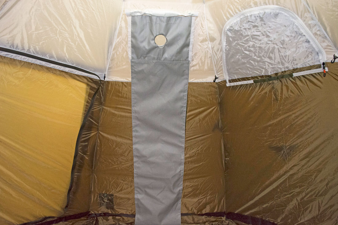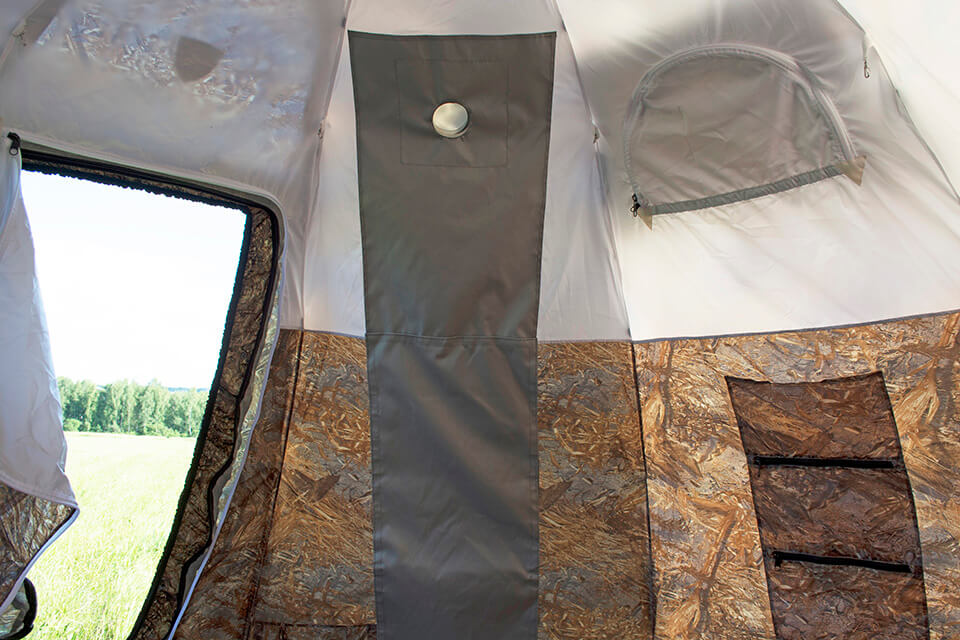 - жаропрочной разделкой дымохода для защиты тента палатки от повреждения горячей трубой (все палатки «Берег» оборудованы данным аксессуаром);