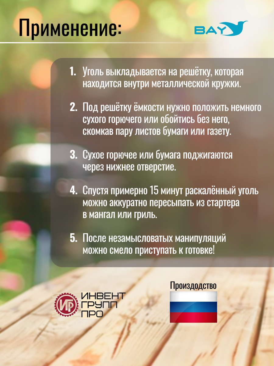 С помощью кружки-стартера процесс приготовления пищи на углях может быть непрерывным – пока готовиться первая партия пищи в это же время готовится вторая партия углей и т.д. Время приготовления угля для гриля в кружке составляет 15-20 минут.