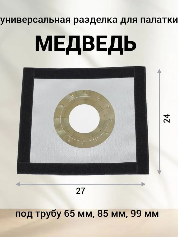 Универсальная разделка для палатки «Медведь» предназначена для безопасного прохождения дымоходной трубы палаточной печи через стену или оконный проём палатки без повреждения тента. Изделие изготовлено из огнеупорной термоткани, устойчивой к нагреву до 300 °C, и предназначено для долговременной эксплуатации в зимних и туристических условиях.