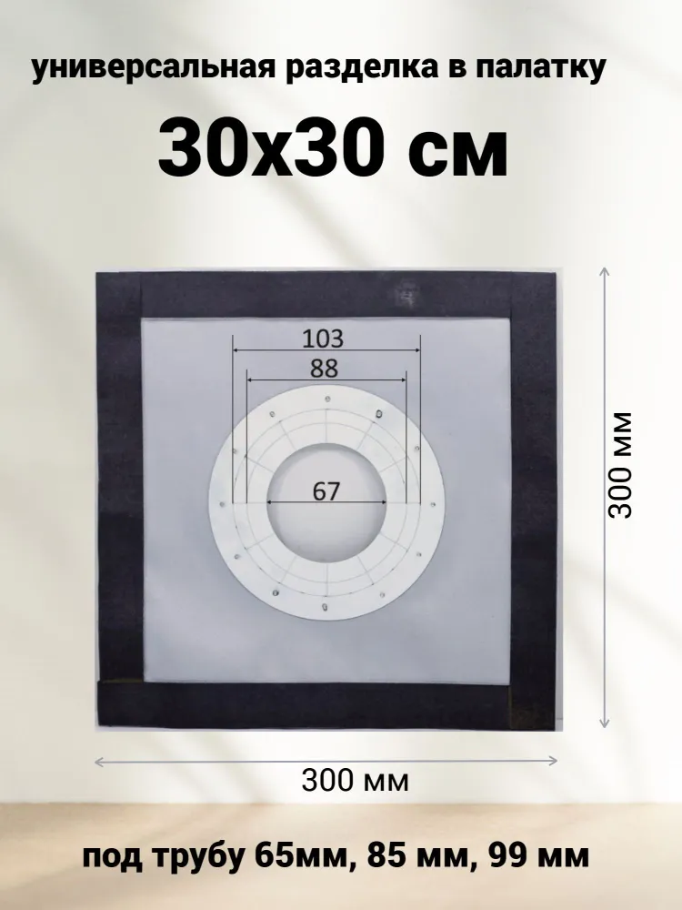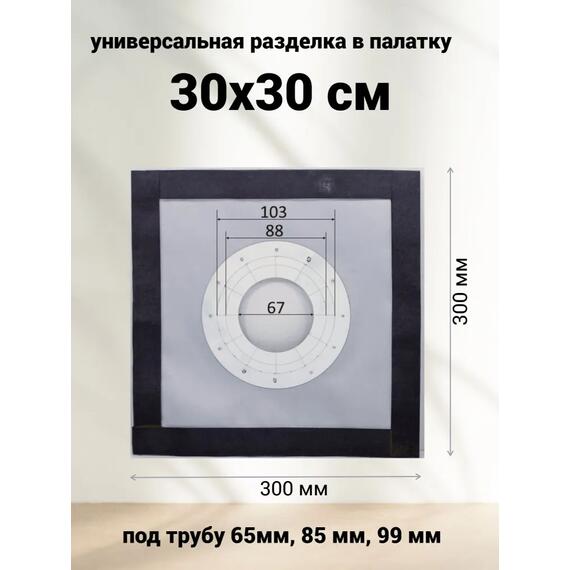 Размер 30×30 см является универсальным и подходит для палаток с соответствующим проемом под установку термостойкой вставки. Разделка может устанавливаться в штатное окно или заранее подготовленный вырез. Простая конструкция позволяет быстро монтировать и демонтировать изделие при необходимости.