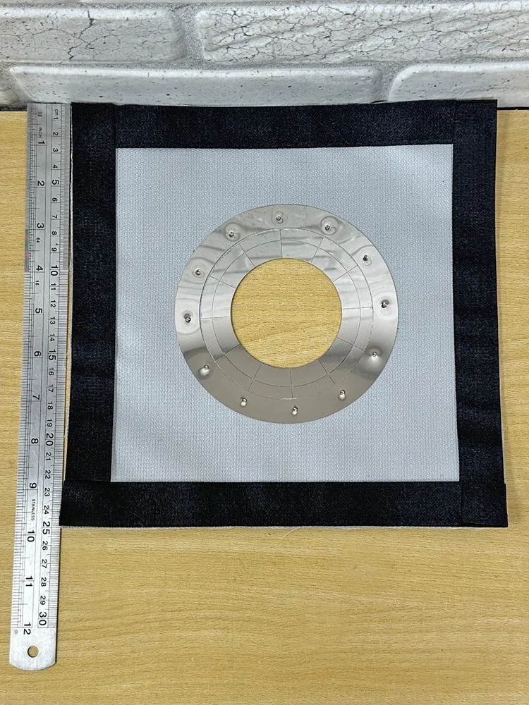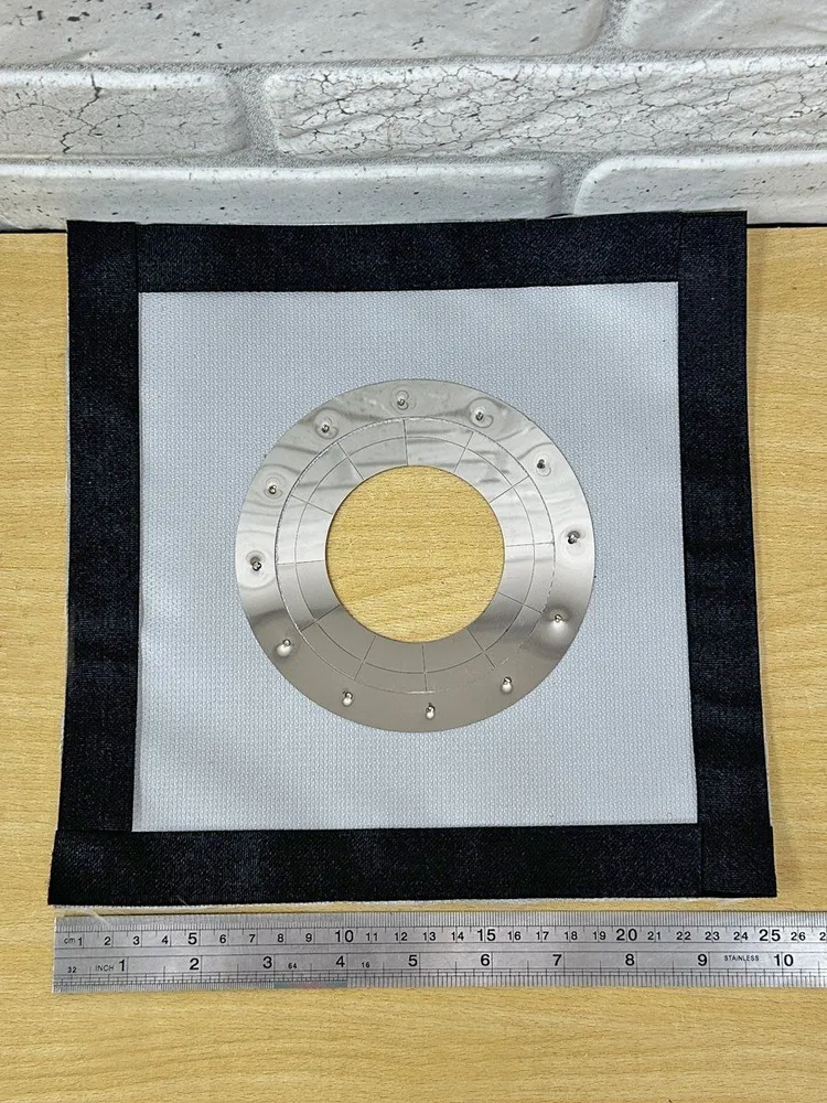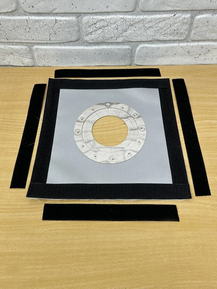 Основа разделки выполнена из термостойкой негорючей ткани, рассчитанной на высокие температурные нагрузки. В центральной части установлено металлическое кольцо из нержавеющей стали, которое усиливает проход дымохода и предотвращает деформацию отверстия под весом трубы. Кольцо имеет модульную конструкцию с несколькими секторами, позволяющими подобрать диаметр под трубы 65, 85 или 100 мм путем удаления лишних элементов.