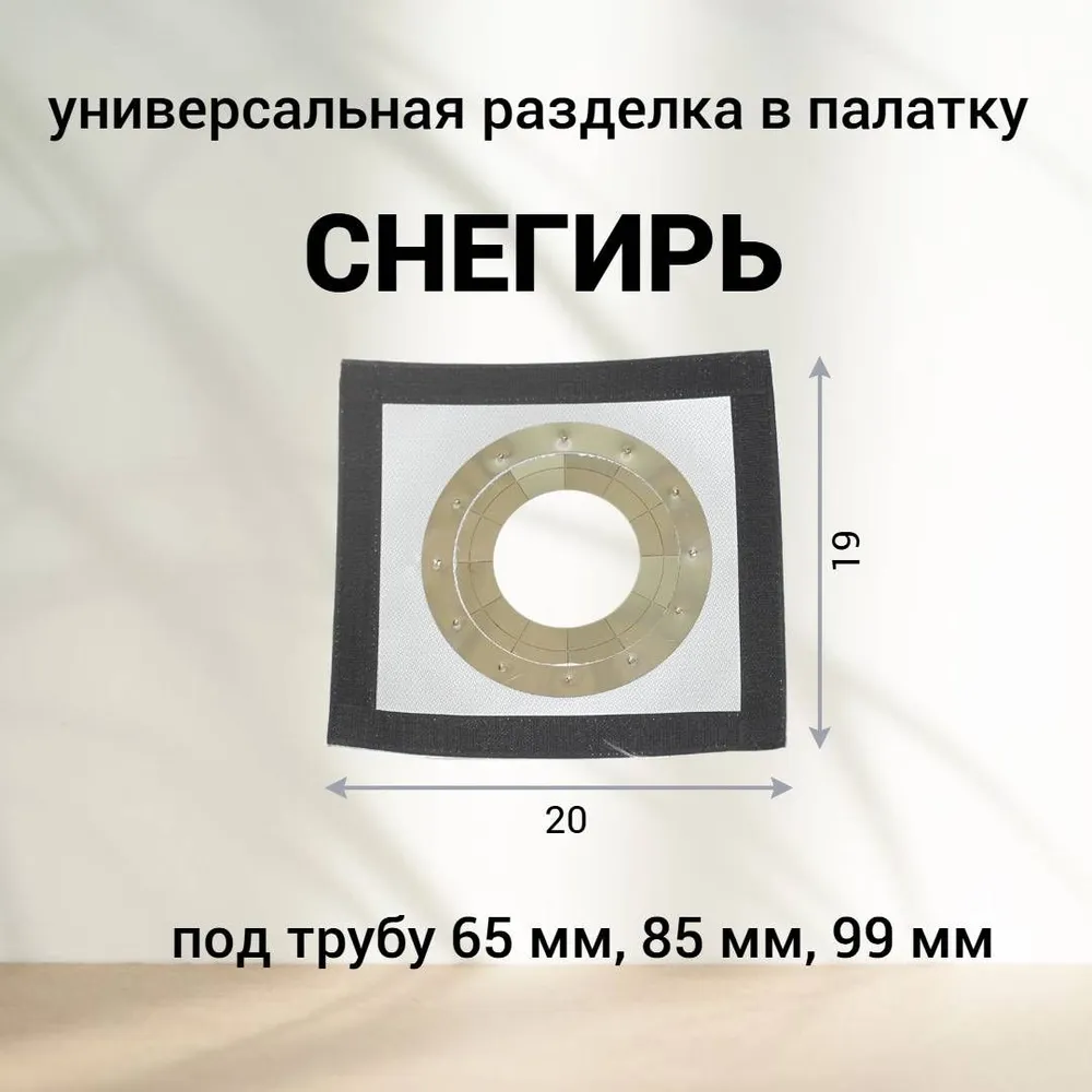 Эта разделка подходит для палаток с окном или вырезом под печку соответствующего размера и обеспечивает удобную установку и прочное крепление. Благодаря универсальной конструкции её можно использовать с различными моделями палаток Снегирь, где требуется термозащита дымохода.