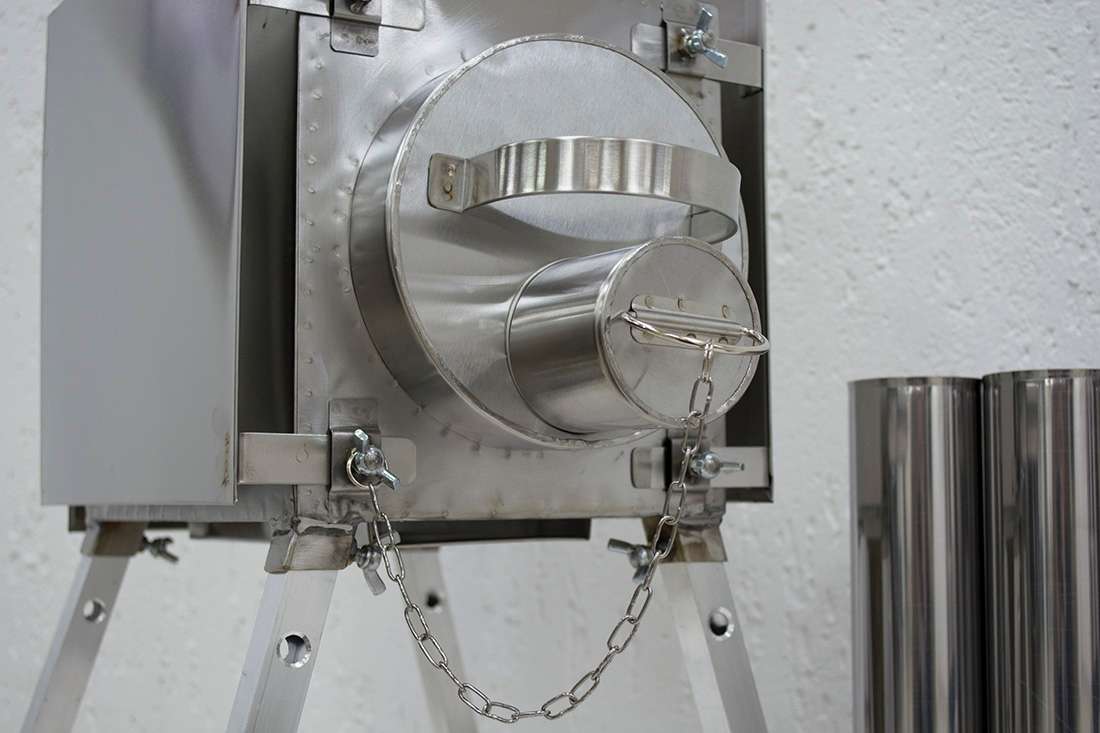 В передней части мини печки Экономка расположена топочная дверца со «стаканом» для регулировки подачи кислорода. Топочная дверца имеет съемную конструкцию без стационарных креплений, таким образом, вероятность поломки сведена к минимуму.
