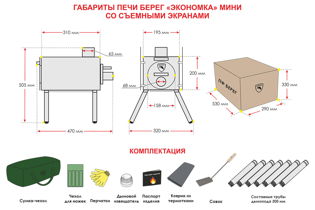 Конструкция всех печей Берег серии «Экономка» включает в себя: короб (топочную камеру), искрогаситель, съемную топочную дверцу со стаканом для регулировки подачи кислорода, отражающие защитные экраны с 4 сторон (кроме печи без экранов, в ней только 1 нижний стационарный экран), съемные ножки, дымоход.