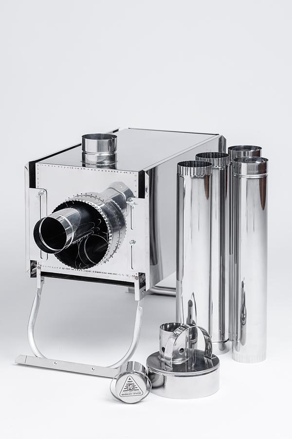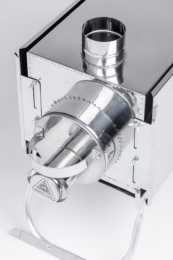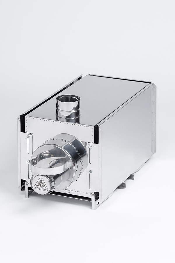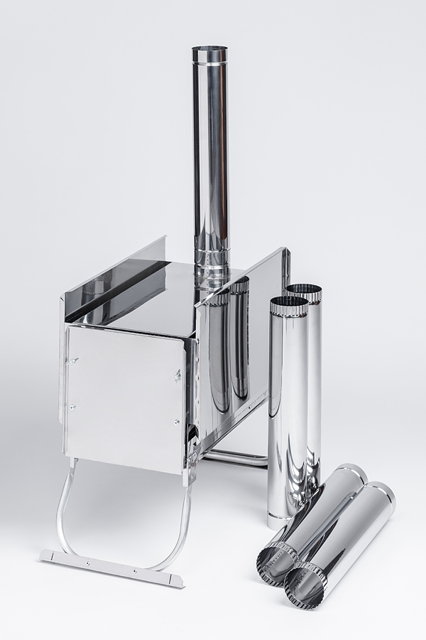 В печь «ИНВЕНТ» вмонтирован — что просто необходимо при использовании печки в палатке, искрогаситель еще и способствует увеличению КПД, так как жар не «вылетает в трубу» напрямую. В то же время искрогаситель служит дополнительным ребром жесткости в верхней части печи. Благодаря ему, варочная поверхность нагревается быстро и равномерно по всей площади. Между искрогасителем и варочной поверхность внутри печи вмонтирован П-образный сегмент, который усиливает верх печи и при закладке камней, она не будет проминаться. Печь полностью выполнена из жаропрочной нержавеющей стали 0,8 мм. марки AISI 430 что в разы увеличивает срок ее службы (гарантия от сквозного прогорания 5 лет), а так же повышает устойчивость к механическим и температурным воздействиям.
