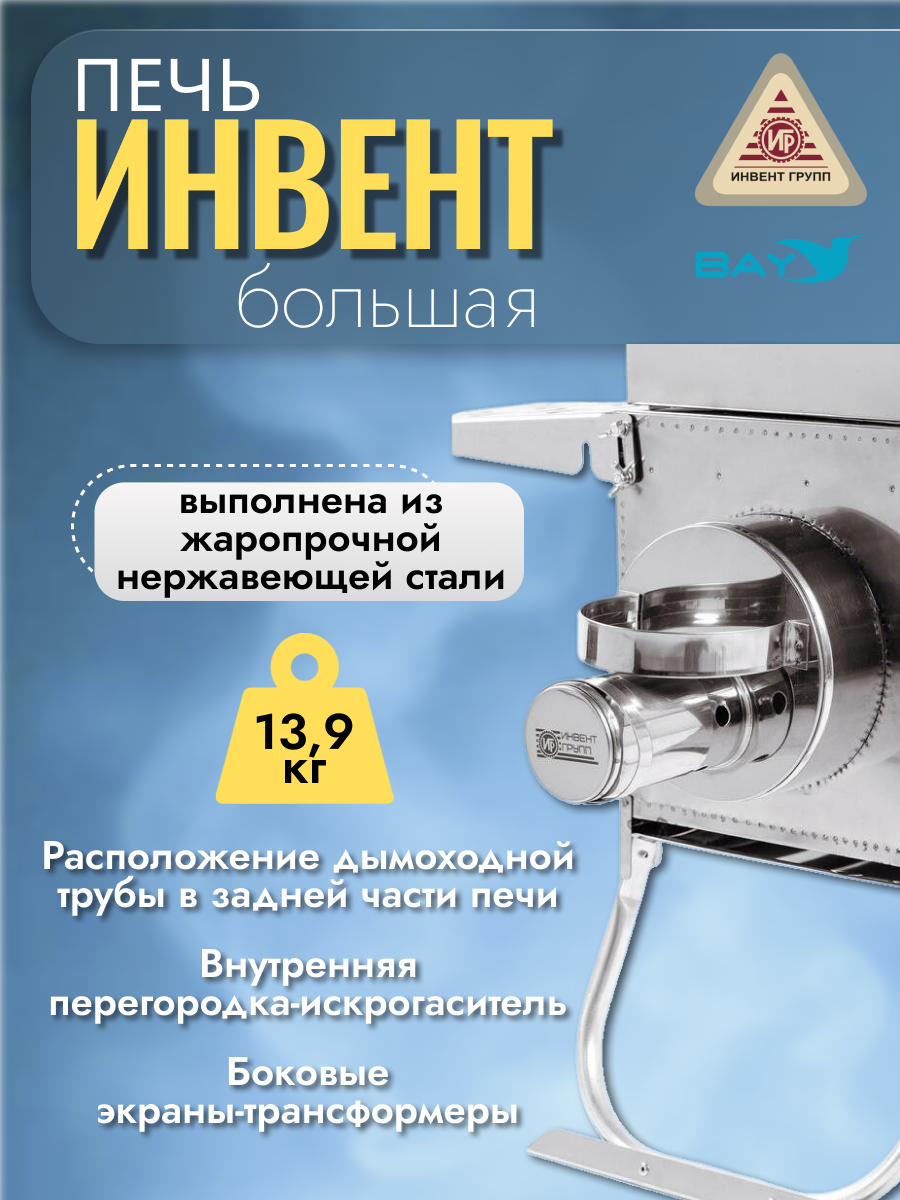 Печь «ИНВЕНТ ПРО» изготовлена из жаропрочной нержавеющей стали.