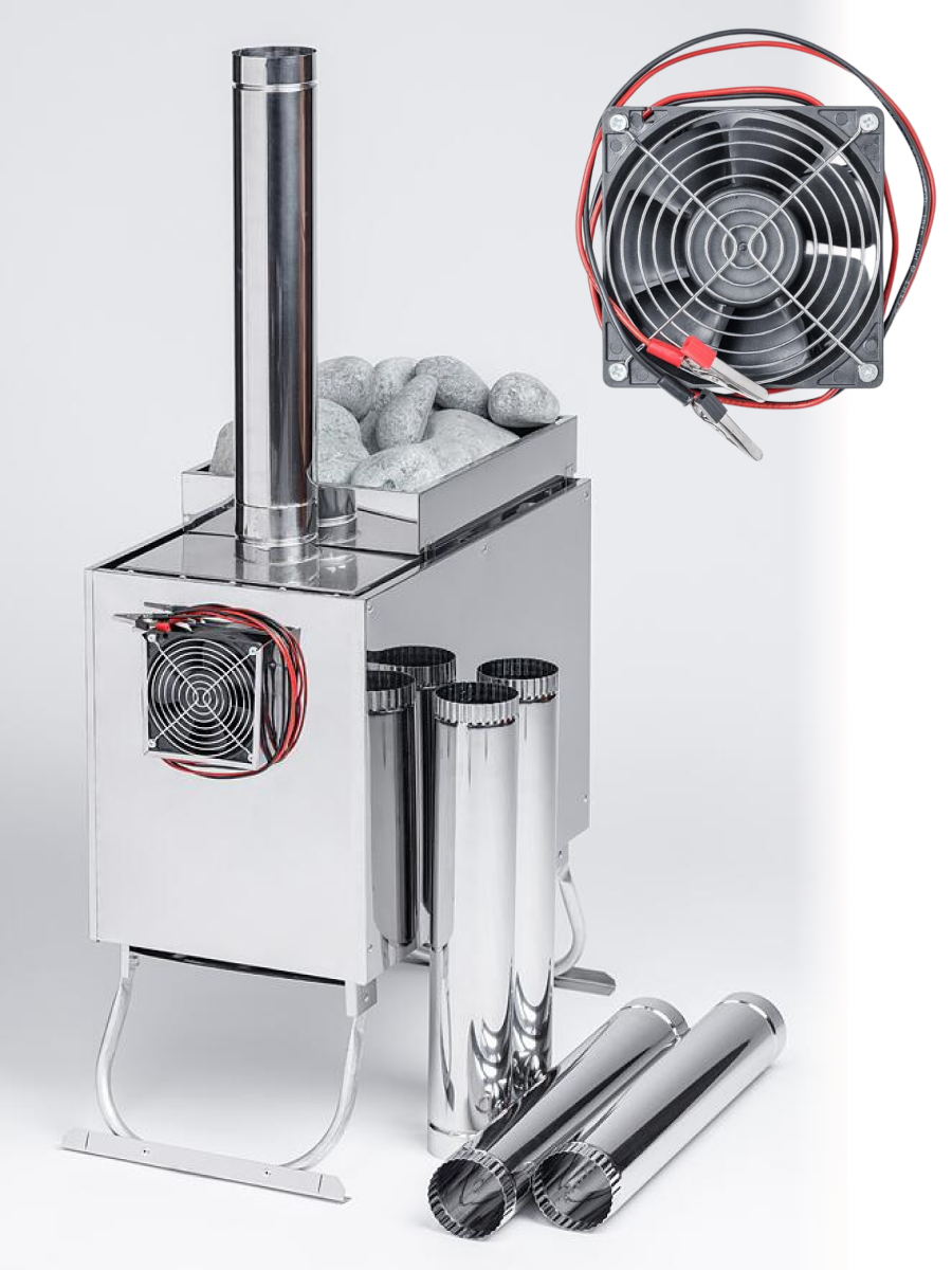 Печь "ИНВЕНТ" средняя со встроенным теплообменником с вентилятором 740х310х490 (нерж.сталь 0,8 мм) со стационарными экранами + короб для камней