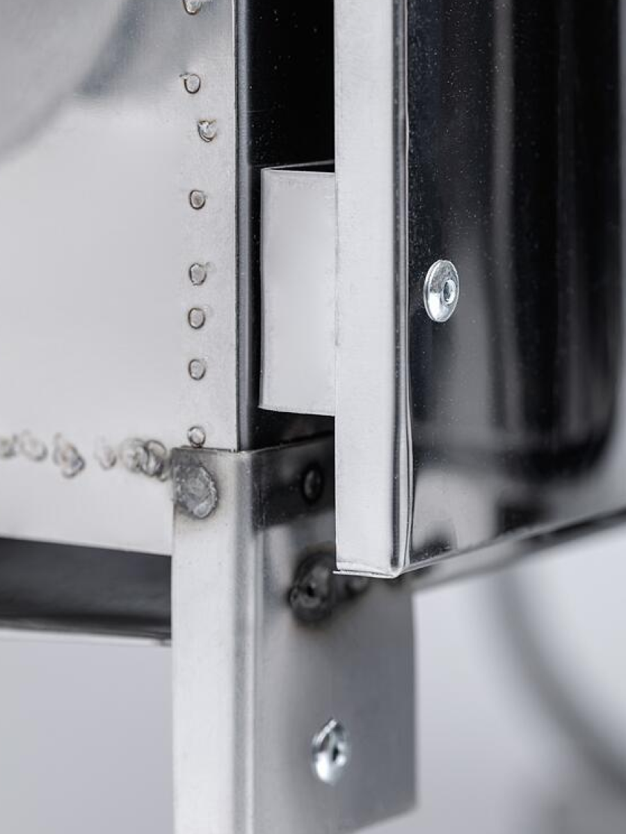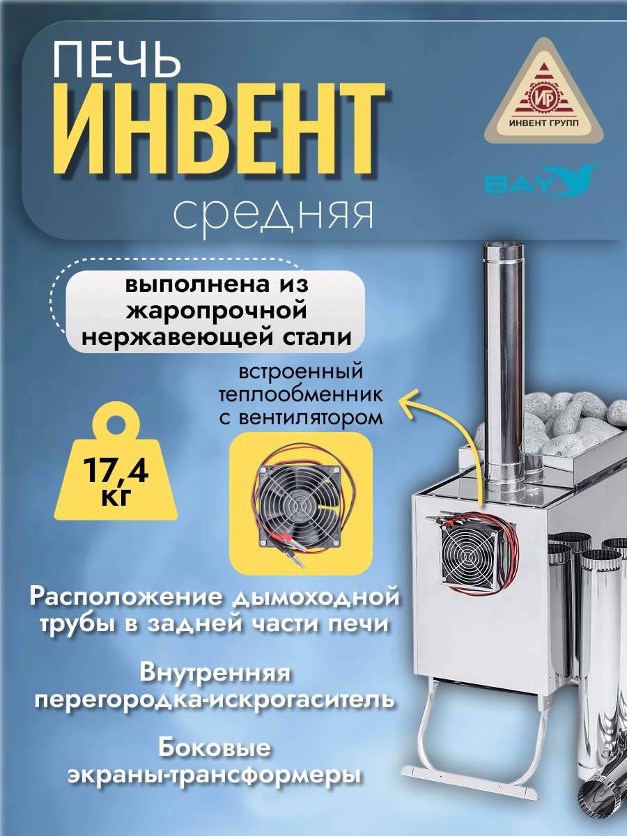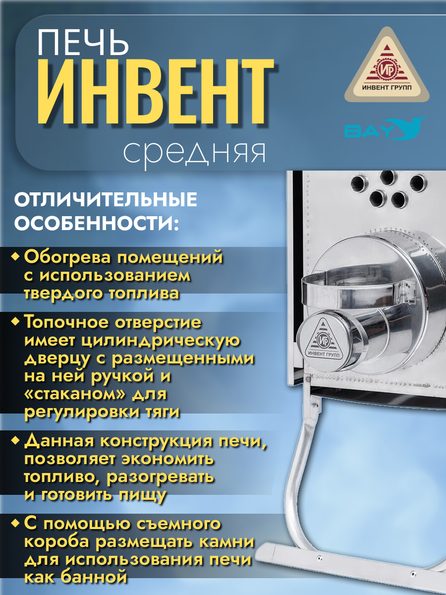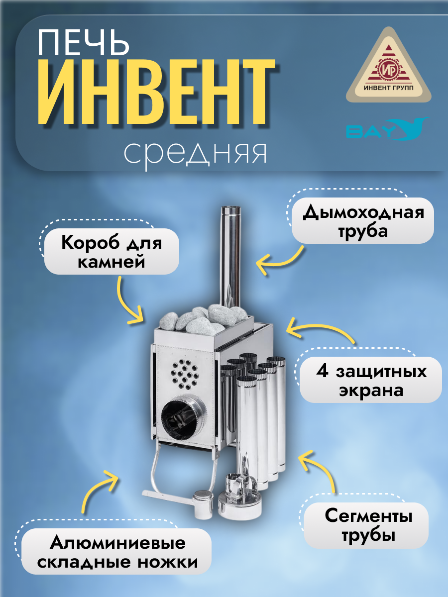 Печь «Инвент» с теплообменником из металлического короба с проходящими через него трубками с внутренней перегородкой-искрогасителем и оборудованным выходом под дымоходную трубу, имеет четыре стационарных защитных экрана, быстросъёмный вентилятор, облегченные алюминиевые складные ножки, съемный короб для закладки камней и дымоходную трубу, состоящую из сегментов. Топочное отверстие имеет круглую дверцу с закрепленными на ней ручкой и «стаканом» для регулировки тяги.