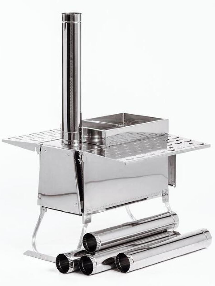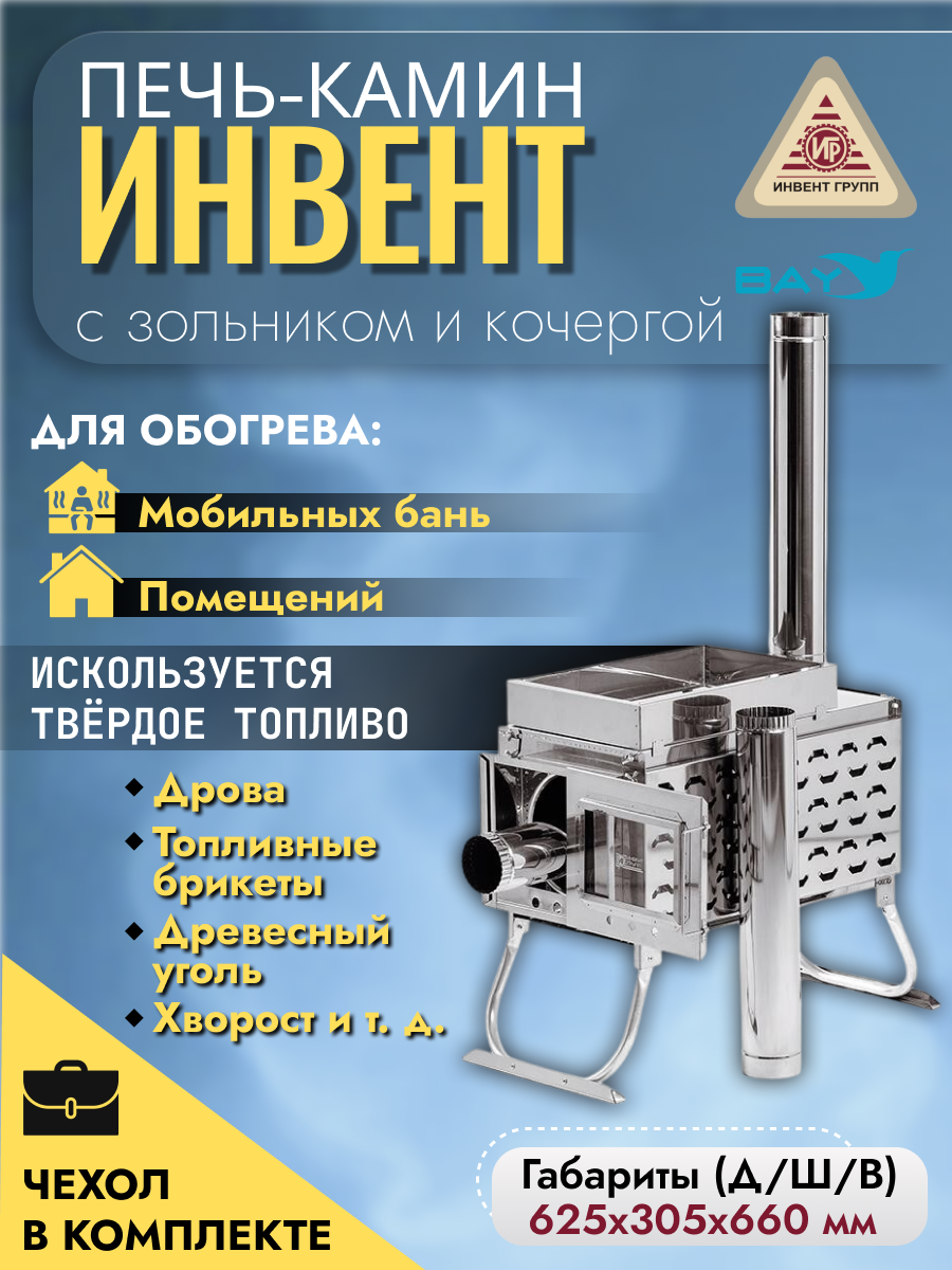 Печь-камин "ИНВЕНТ ПРО" для походной (мобильной) бани 625х305х460 (нерж.сталь 0,8/1,0 мм) со стационарнми экранами, колосником, зольником и кочергой, топка толщиной 1 мм. объёмом 25 л.
