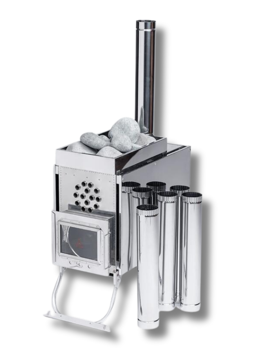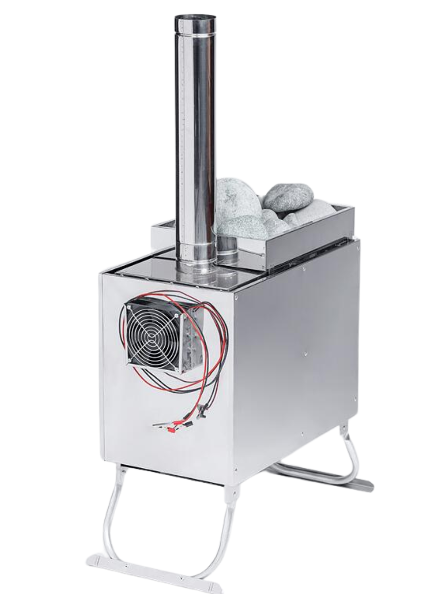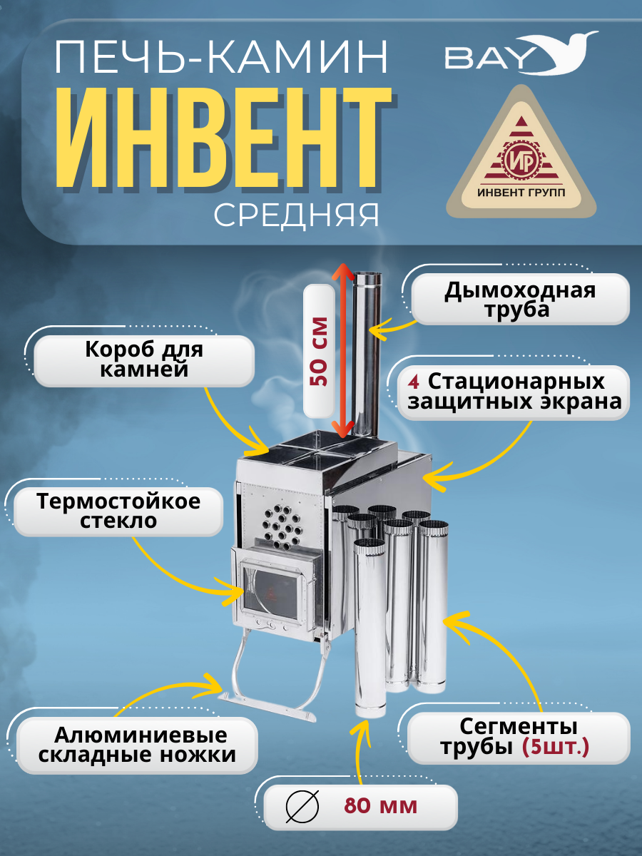 Печь-камин с теплообменником состоит из металлического короба с проходящими сквозь него трубками с внутренней перегородкой-искрогасителем и оснащенным выходом под дымоходную трубу, имеет четыре стационарных защитных экрана, быстросъёмный вентилятор, облегченные алюминиевые складные ножки, съемный короб для закладки камней и дымоходную трубу, состоящую из сегментов. Топочное отверстие имеет дверцу с ручкой в виде слайдерной крышки с термостойким стеклом и отверстиями для регулировки тяги.