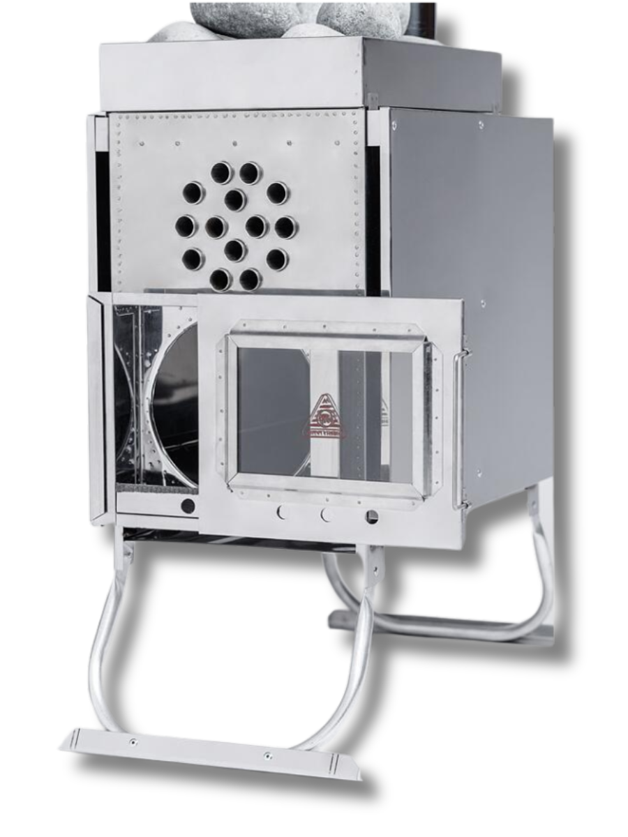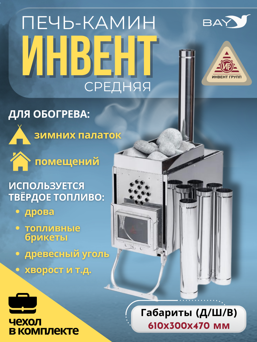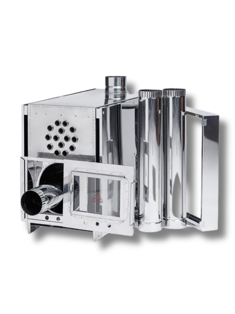 Печь-камин с теплообменником предназначена для обогрева помещений (зимних палаток) в условиях сурового севера, с использованием твердого топлива (дрова, топливные брикеты, древесный уголь, хворост и т.п.).