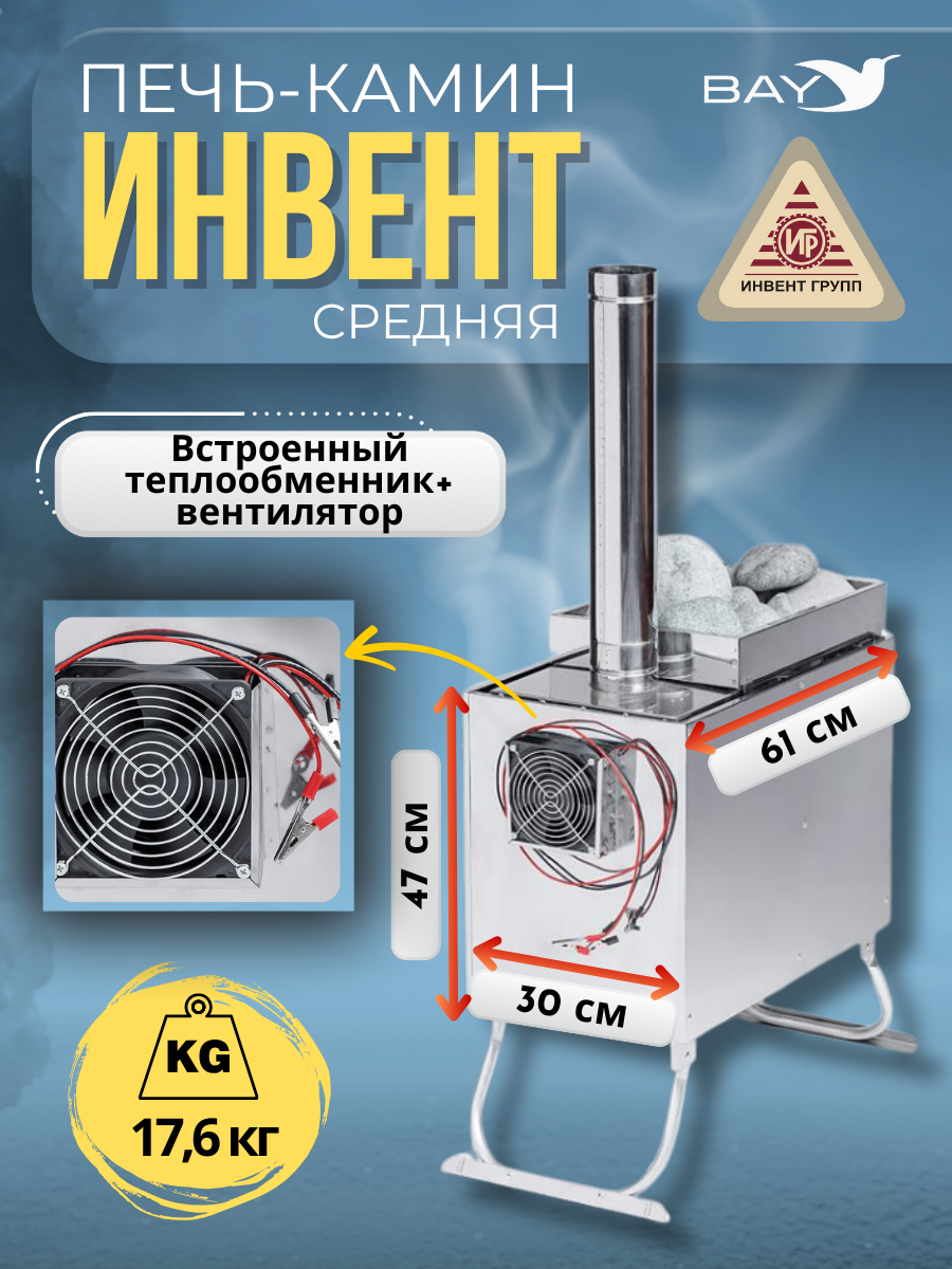 Печь-камин "ИНВЕНТ" средняя со встроенным теплообменником с вентилятором 610х300х470 (нерж.сталь 0,8 мм) со стационарными экранами + короб для камней