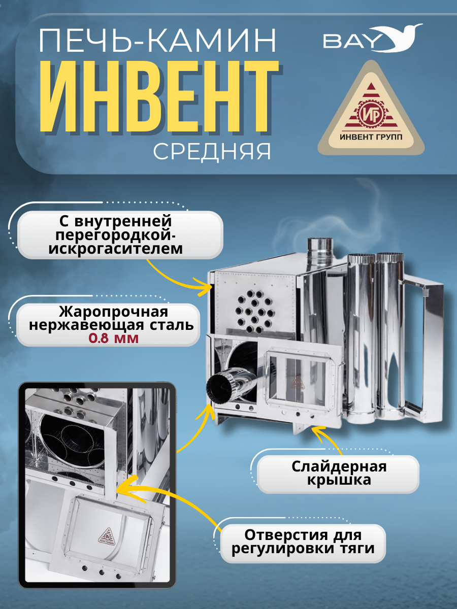 Печь-камин «Инвент» с теплообменником выпускается двух типоразмеров: малая, средняя.