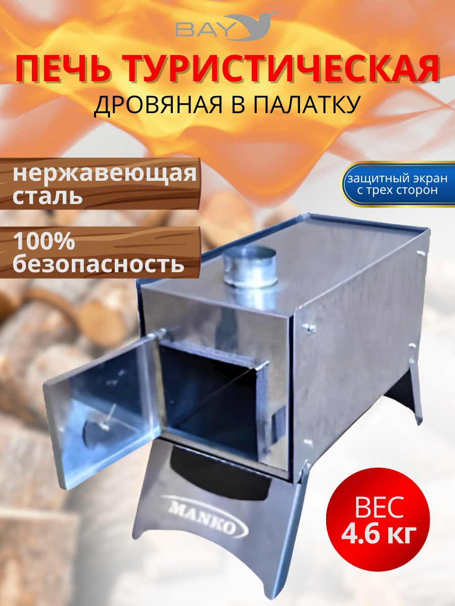 Дровяная туристическая печь большая буржуйка в первую очередь предназначена для отопления палаток во время рыбалки или походов. Но также может использоваться для отопления гаражей, дачи при соблюдении правил дымоотвода. Отопительная буржуйка от компании Мanko из Беларуси создана для комфортного отдыха вне дома в холодное время года. Ее применяют для обогрева палатки на зимней рыбалке, охоте или кемпинге и пикнике. Также подходит для отопления домика на даче, а также в шатер палатки и походной бани. Буржуйка отопительная сможет вас обогреть в холодную погоду на рыбалке. Вы можете подогреть вашу еду поставив ее на свободную верхнюю поверхность печи. Еще это как камин – для ностальгии в не дома. Желаем хорошего отдыха!Походная печка изготовлена из нержавеющей стали AISI 430. Имеется защитный экран на расстоянии 2 см от самой печи для защиты от ожогов и комплектующие для его монтирова и комплектующие для его монтирования. Время эффективного обогрева до 6 часов на одной закладке как дома на даче, так и в многоместной палатке. Легко помещается в багажнике. Подходит для зимовок, небольших складов или жилых комнат. Благодаря компактным размерам буржуйку можно поставить в любое место дачного домика, шатра или гаража. Она с легкостью поместится в багажник автомобиля. Тонкая регулировка поддувала позволяет контролировать интенсивность горения в нужных пределах, что дает существенную экономию топлива и высокий КПД. Топить можно брикетами, паллетами, дровами или древесным углем. Благодаря отсутствию открытого огня на обогревателе можно сушить промокшую экипировку рыбака охотника туриста или дачника. Туристическая голландка для палаток разработана как альтернатива газовым обогревателям, она безопасная и экологична. Рекомендуется использовать датчик угарного газа СО2 для измерения его концентрации в палатке или дачном доме (в комплект не входит). Сталь 0,8 мм