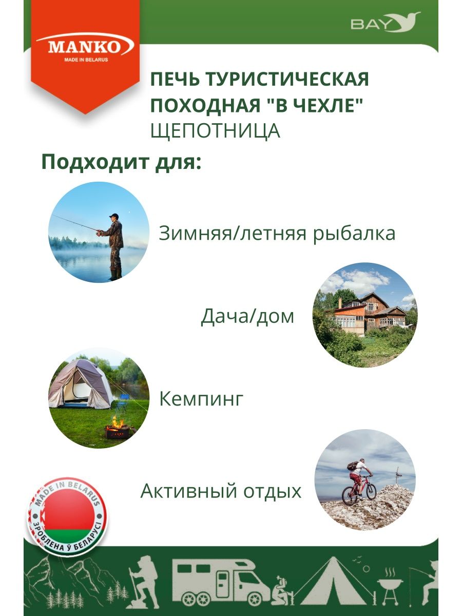 Походная печь от компании MANKO! Незаменимая вещь для отдыха на природе, на рыбалке, на охоте, в походе, дача, на пикнике. Печь туристическая имеет конструкцию позволяющую легко и быстро её собрать. А в разобранном виде практически не занимает места. Щепочница предназначена для приготовления пищи или подогрева воды на открытом воздухе. В виде топлива могут быть щепки, сухие ветки, шишки и т.п. Походная печка изготовлена из металла 1,5 мм покрытым жаростойким материалом, что сохраняет её долговечность. Габариты позволяют поместить в карман, в разложенном виде 12*12*15 см. - Печь "Турист-мини". Печь "Турист" габариты - 16*16*18см. 1,5 кг. Печь щепотница микро 8х8х9 см 250г. для туризма походов в палатку. К комплекте щепотница, чехол для транспортировки и хранения. Отличный подарок рыбаку, охотнику на новый год. Создайте комфортный отдых на природе с труба печкой "Турист мини". Отличный подарок друзьям, мужу. Новый год! День рождение! 23 февраля! День рыбака! День туриста.
