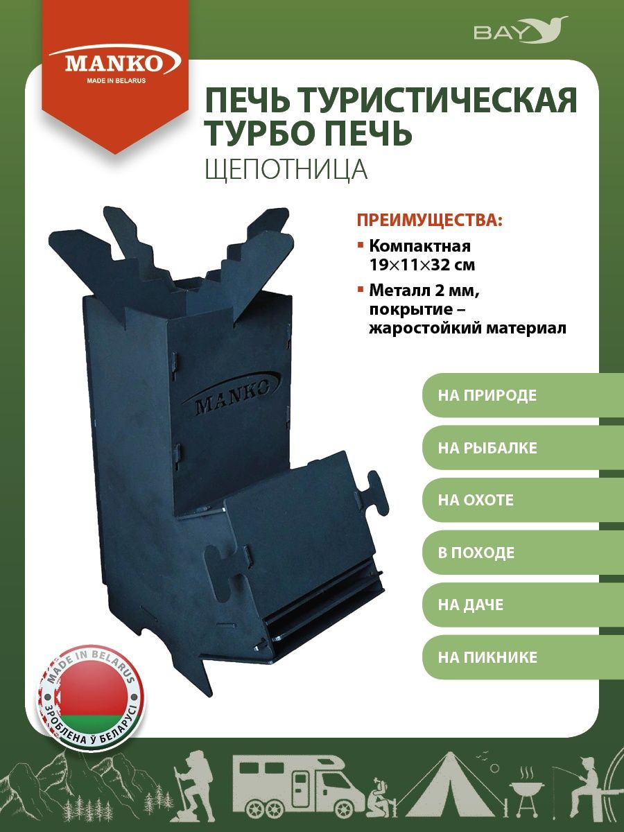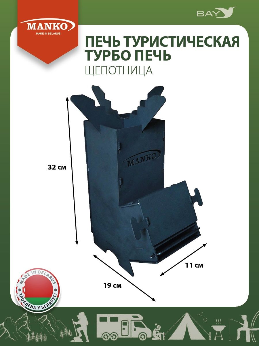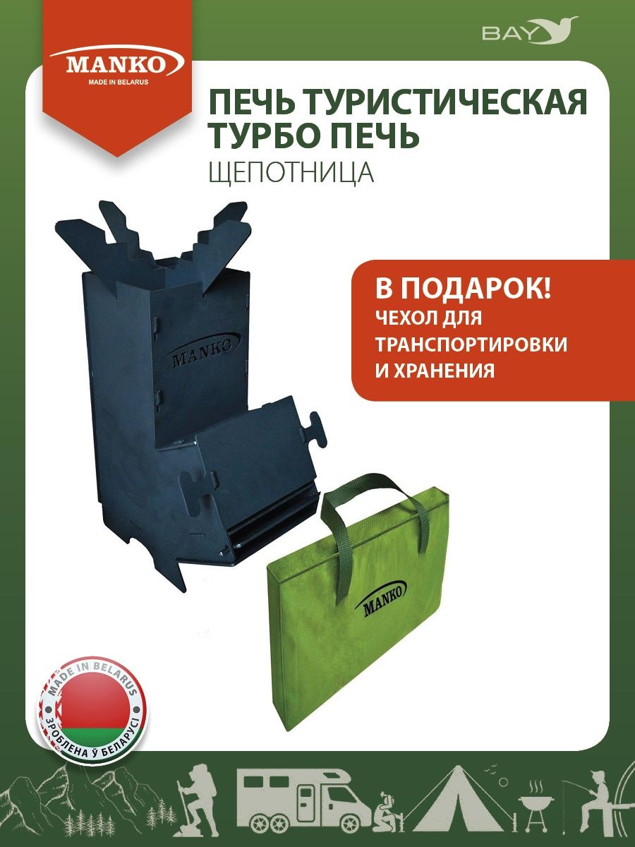 Туристическая печь (щепотница) от компании MANKO! Незаменимая вещь для отдыха на природе, на рыбалке, на охоте, в походе, дача, на пикнике. Конструкция печи туристической позволяет легко и быстро её собрать. А в разобранном виде практически не занимает места. Щепочница предназначена для приготовления пищи или подогрева воды на открытом воздухе. В виде топлива могут быть щепки, сухие ветки, шишки и т.п. Походная печь изготовлена из металла 2 мм покрытым жаростойким материалом, что сохраняет её долговечность. Габариты в разложенном виде 19*11*31 см. К комплекте турбо печь, чехол для транспортировки и хранения. Создайте комфортный отдых в зимнее время или в межсезонье! Оригинальный подарок друзьям, папе, мужу. Подарок Новый год! День рождение!