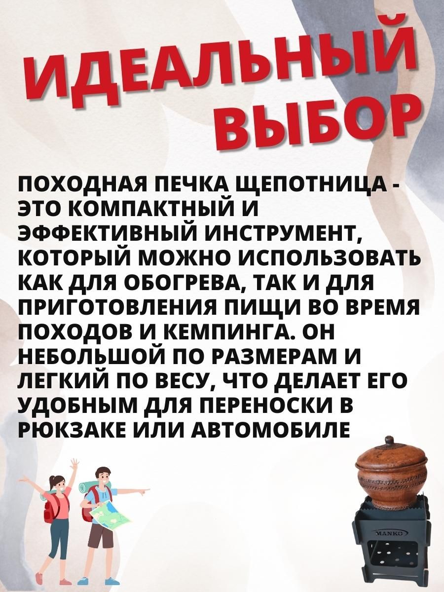 Во время похода, очень важно иметь быстрый способ для приготовления еды. Туристическая печь Элит - это тот недостающий элемент в вашем инвентаре! Это незаменимый атрибут во время вашего похода. Её без труда можно брать с собой на рыбалку, охото или в лес. Печь для туризма поможет вам во время кемпинга. Вы можете готовить и разогревать туристическую пищу возле палатке, а хорошее горение поможет сделать это быстрее. Это мини кухня! В качестве топлива, вы можете использовать щепу, шишки, сухой спирт, дрова. На подставку в виде решетки можно ставить небольшой посуду, чтобы приготовить себе перекус или полноценный обед. Щепочница не имеет дымохода, топка открытого типа. Печь выживайка переносная и разборная. В своём сложенном состоянии не занимает места, что важно во время похода на природу, горы и тд. Чтобы собрать, вам потребуется всего 40 секунд, с этим справится любой: рыбак, турист и даже ребёнок. Для переноски и хранения в комплекте идет качественный чехол. Печь буржуйка от белорусского производителя MANKO. Она выполнена из стали - 1,5 мм. Есть три размера: 8*8*9см, 12*12*15см и 16*16*18см. Печь простая и намного дешевле своих газовых аналогов. Дровяная мини печь должна быть в вашем снаряжении в походе. Похожие товары вы можете посмотреть в нашем магазине! Также у нас есть товары для рыбалки, туризма.