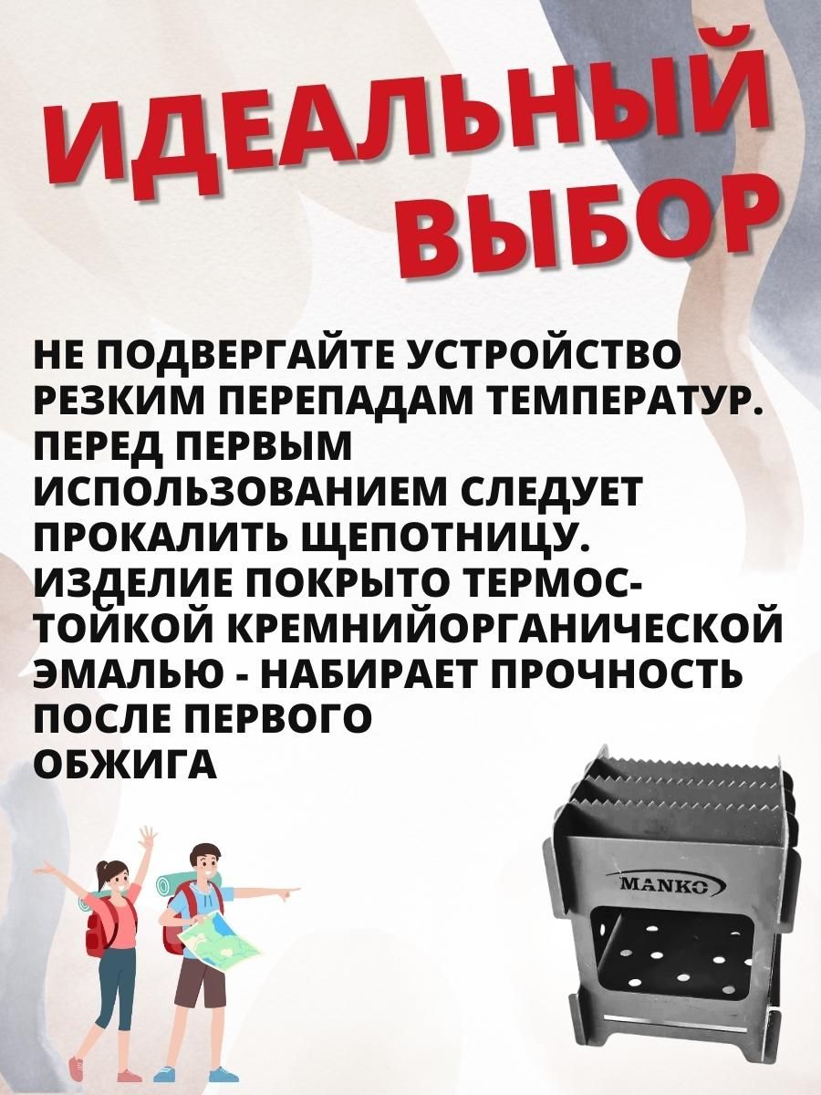 Во время похода, очень важно иметь быстрый способ для приготовления еды. Туристическая печь Элит - это тот недостающий элемент в вашем инвентаре! Это незаменимый атрибут во время вашего похода. Её без труда можно брать с собой на рыбалку, охото или в лес. Печь для туризма поможет вам во время кемпинга. Вы можете готовить и разогревать туристическую пищу возле палатке, а хорошее горение поможет сделать это быстрее. Это мини кухня! В качестве топлива, вы можете использовать щепу, шишки, сухой спирт, дрова. На подставку в виде решетки можно ставить небольшой посуду, чтобы приготовить себе перекус или полноценный обед. Щепочница не имеет дымохода, топка открытого типа. Печь выживайка переносная и разборная. В своём сложенном состоянии не занимает места, что важно во время похода на природу, горы и тд. Чтобы собрать, вам потребуется всего 40 секунд, с этим справится любой: рыбак, турист и даже ребёнок. Для переноски и хранения в комплекте идет качественный чехол. Печь буржуйка от белорусского производителя MANKO. Она выполнена из стали - 1,5 мм. Есть три размера: 8*8*9см, 12*12*15см и 16*16*18см. Печь простая и намного дешевле своих газовых аналогов. Дровяная мини печь должна быть в вашем снаряжении в походе. Похожие товары вы можете посмотреть в нашем магазине! Также у нас есть товары для рыбалки, туризма.