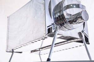 - 3D-экран закрывает печку снизу, полностью снимая тепловое излучение на основание. Это позволяет безопасно устанавливать печку на пол палатки и существенно уменьшает таяние льда под печкой. Так же повышается КПД печи, т.к. тепло не уходит на нагрев грунта.