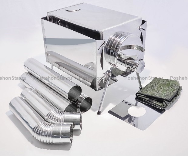 В стандартный комплект входят:Сумка-чехол, Трубы прямые 50см*3шт, Трубы угловые 45 град х 2 шт, Ножки алюминиевые, Металлическая разделка трубы установки в палатку, тент, теплицу.