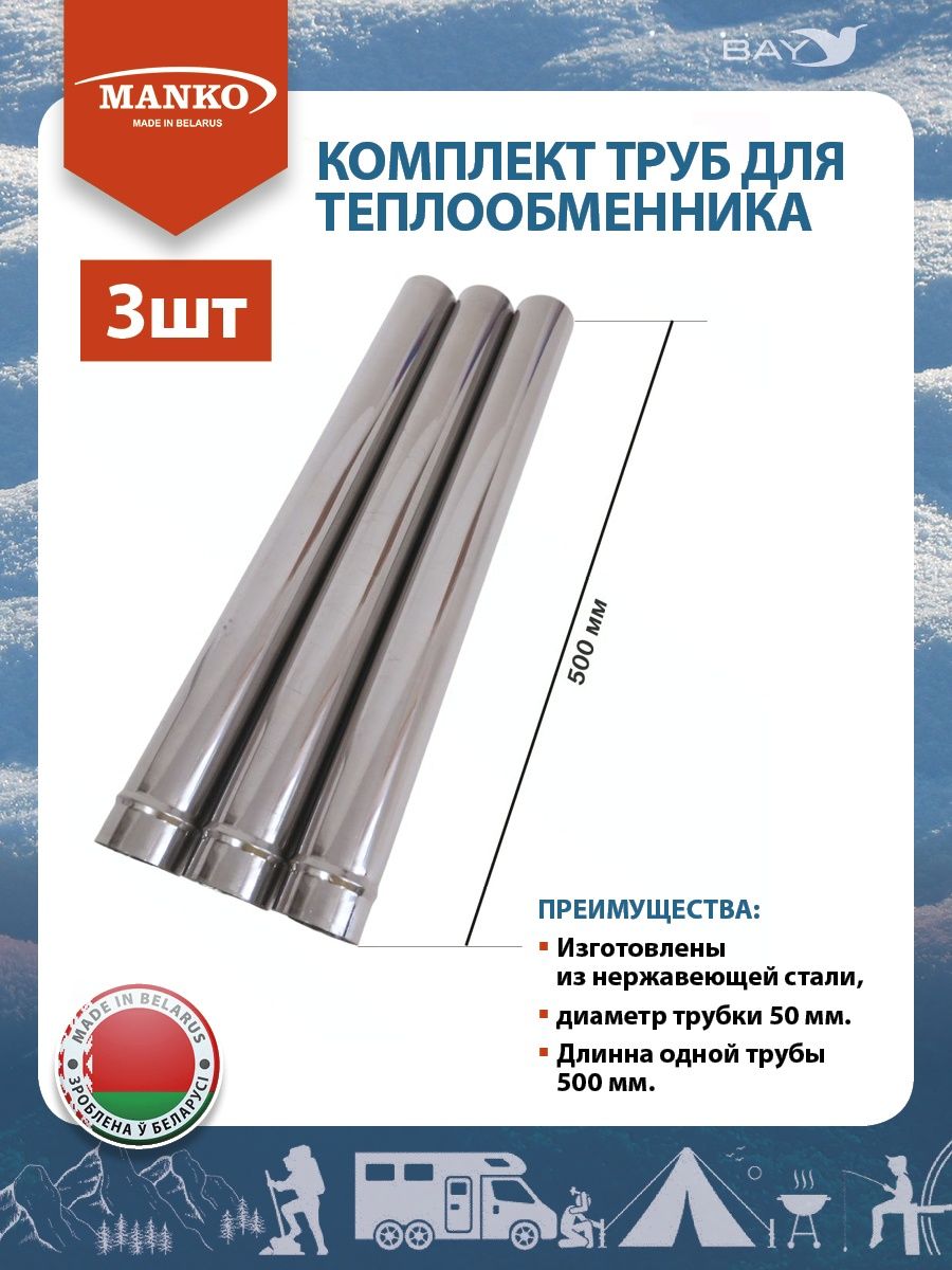 Комплект труб 3 шт. или 1 шт. для теплообменника от компании MANKO! Изготовлены из нержавеющей стали диаметр трубки 50 мм. Длина одной трубы 500 мм. Трубы также можно использовать для различных печей и т.п.. В комплекте 3 трубы и чехол для хранения! Запасная часть для теплообменников на 18 и 32 трубы. Будь предусмотрительным. Пусть всегда будет про запас. Аксессуар для теплообменника. Запасная часть. Подарок другу рыбаку себе. Теплообменник 18 труб. Арт 140803127, Теплообменник на 32 трубы Арт 140809310. Позаботься о тепле во время похода рыбалки зимнего отдыха.